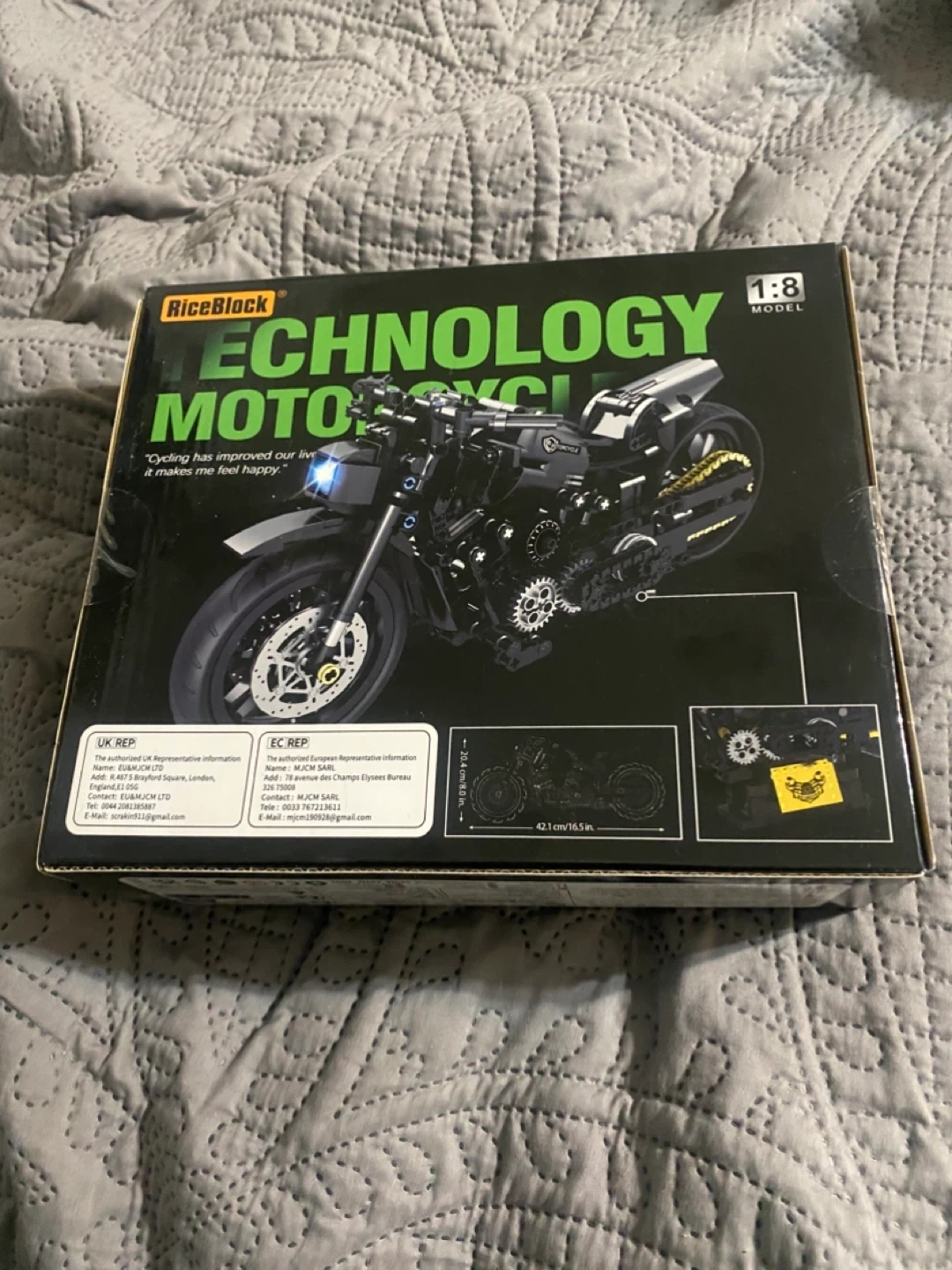 This is a RiceBlock Technology Motorcycle building set. It's a 1:8 scale model. The assembled dimensions are 42.1 cm (16.5 in) long and 20.4 cm (8.0 in) high.