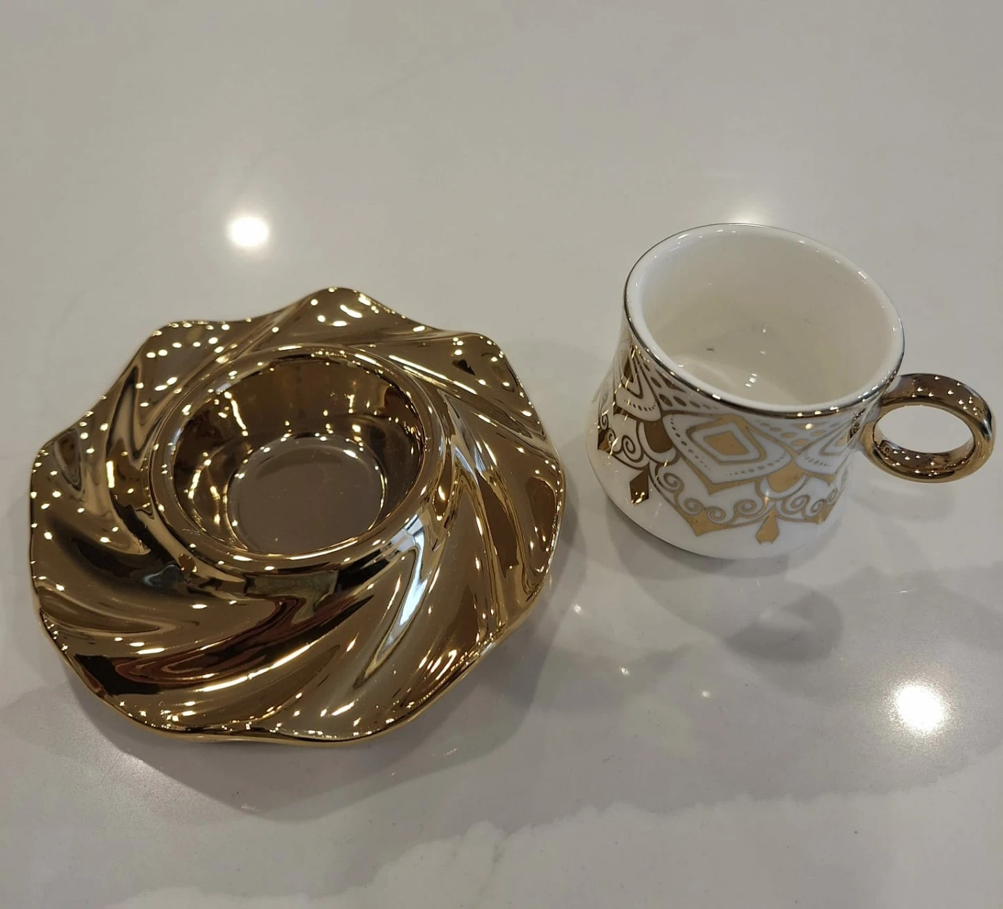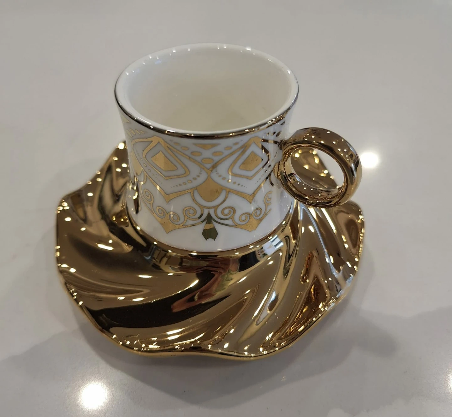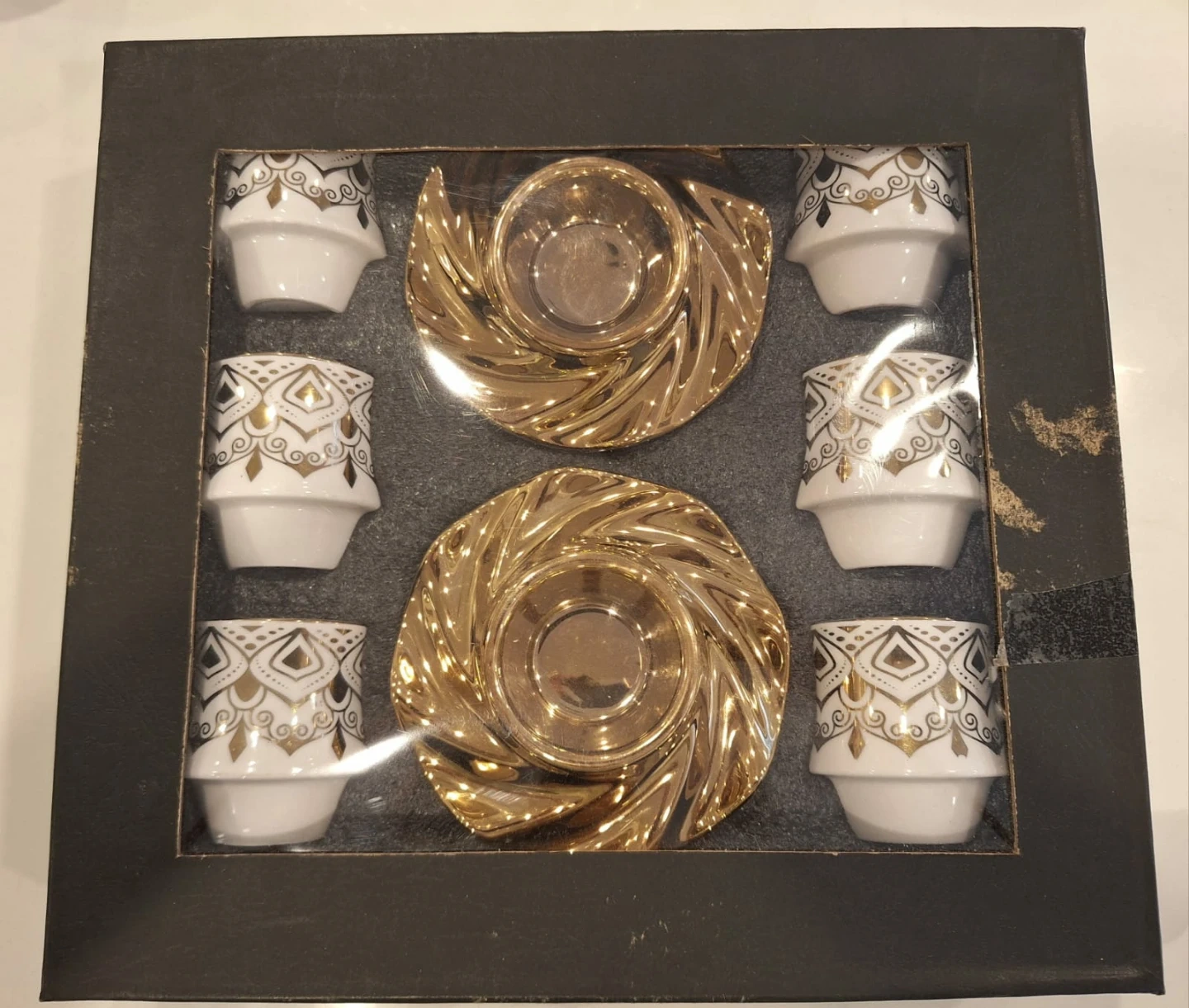NEW! Beautiful white and gold plated Turkish coffee/tea set for 6 in original box. Selling for less than half-price!