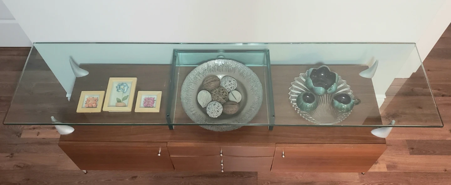 * Topped with a clear glass surface.