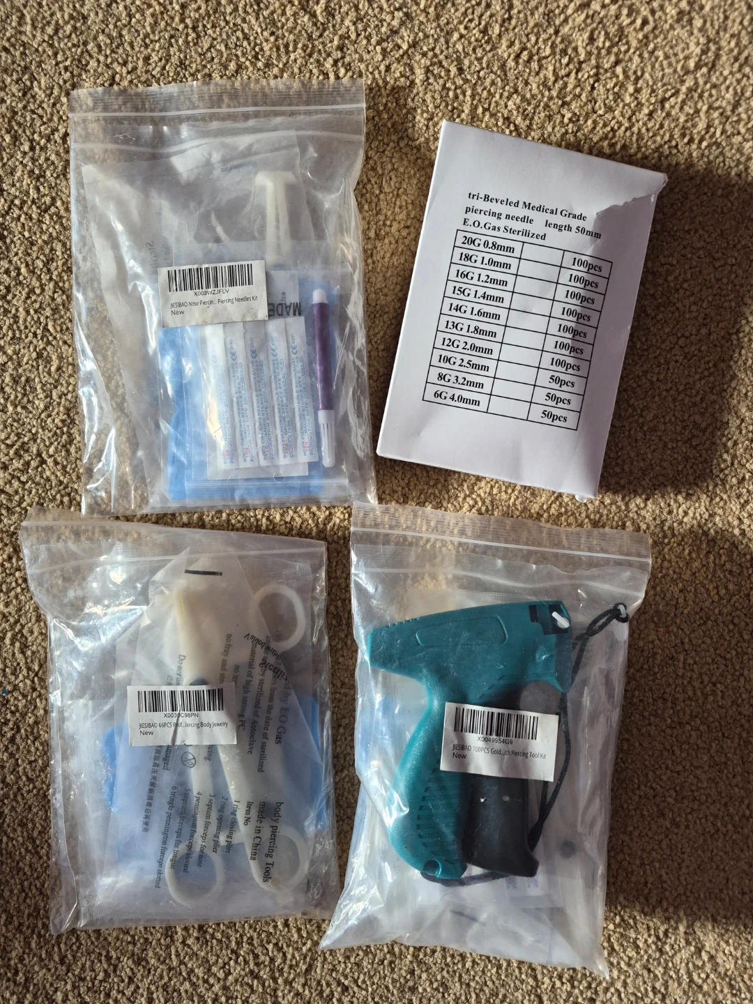 This JIESIBAO kit includes medical-grade piercing needles in various sizes, from 20G to 6G. It also comes with a body piercing tool kit featuring closing and opening pliers, septum forceps, and pennington forceps. All items are EO Gas sterilized.