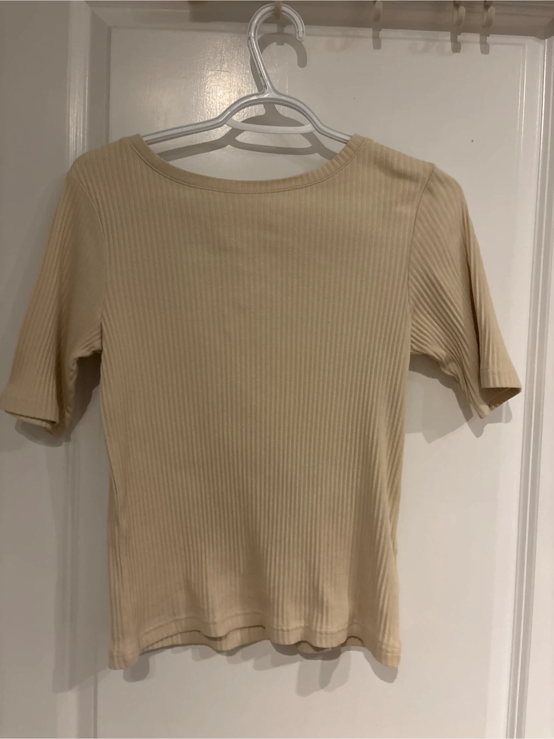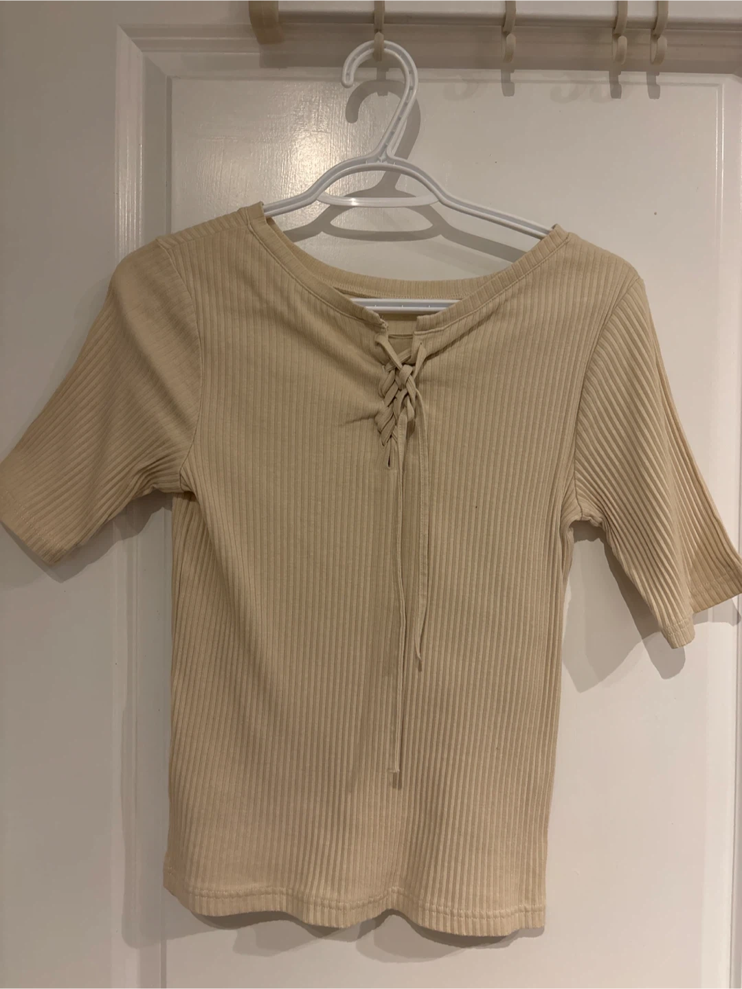 This beige shirt has a ribbed texture and a lace-up detail at the neckline. It features short sleeves and a comfortable fit. Perfect casual work top. Made from a stretchy knit material. Bought at GU Hong Kong (Uniqlo’s Sister brand)