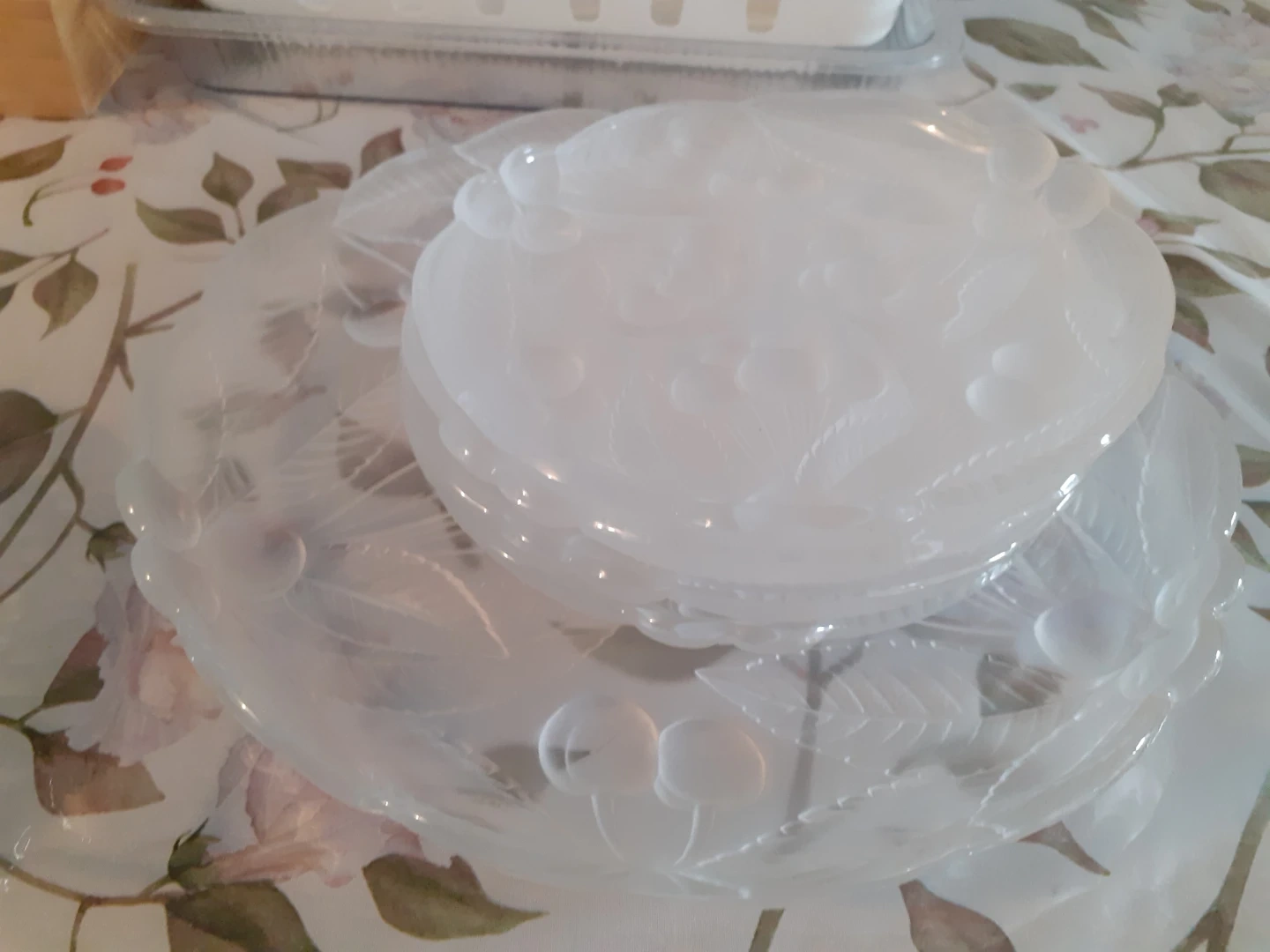 Set includes a glass divided serving platter with a silver-toned metal stand. Also features a frosted glass serving dish with lid and several matching frosted glass small plates, all embossed with a cherry blossom design. Perfect for serving appetizers or desserts at gatherings!