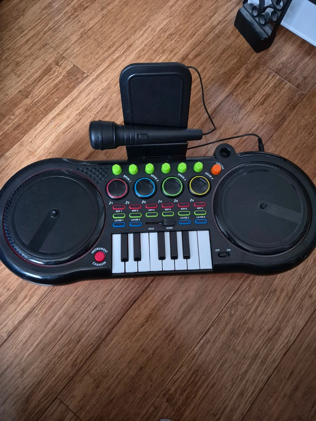 This DJ mixer keyboard for kids comes with a built-in microphone and various sound effects. It features drum pads, keyboard keys, and scratch decks for creative play. Functions include drum beats, riff options, and layer controls.