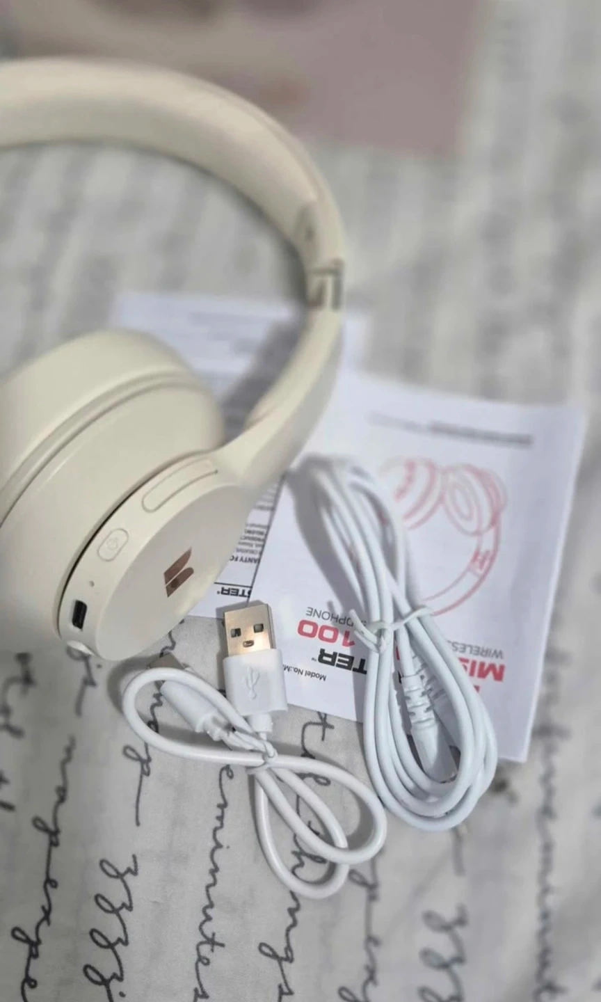 Mission 100 wireless over-ear headphones with 40mm audio drivers. Offers over 30 hours of playback and a quick charge mode. Includes charging cable and manual. Great for everyday listening!