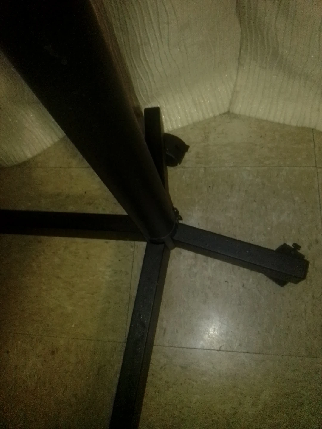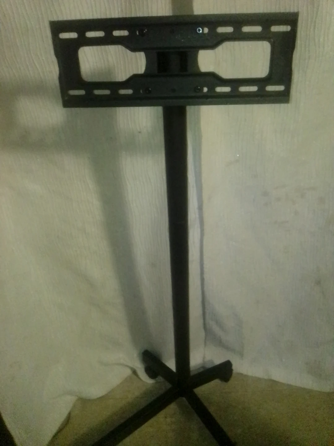 This black metal TV stand offers a sturdy base for your television. It's designed with a stable, cross-shaped leg system and includes wheels for easy mobility. Height-adjustable mount.