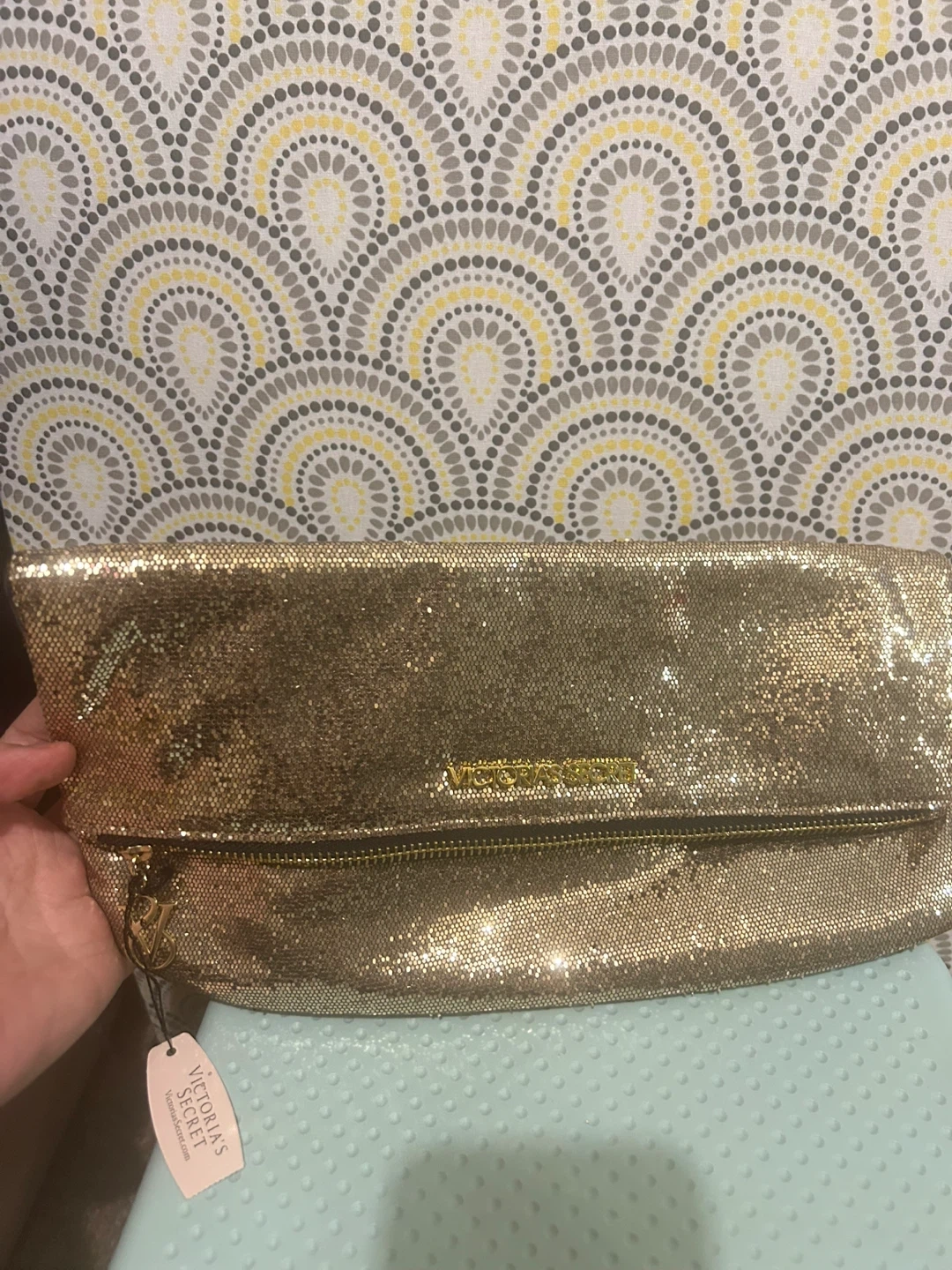 Sparkly gold sequin clutch bag from Victoria's Secret. It has a zip closure and a fold-over design. A stylish accessory for evenings out!