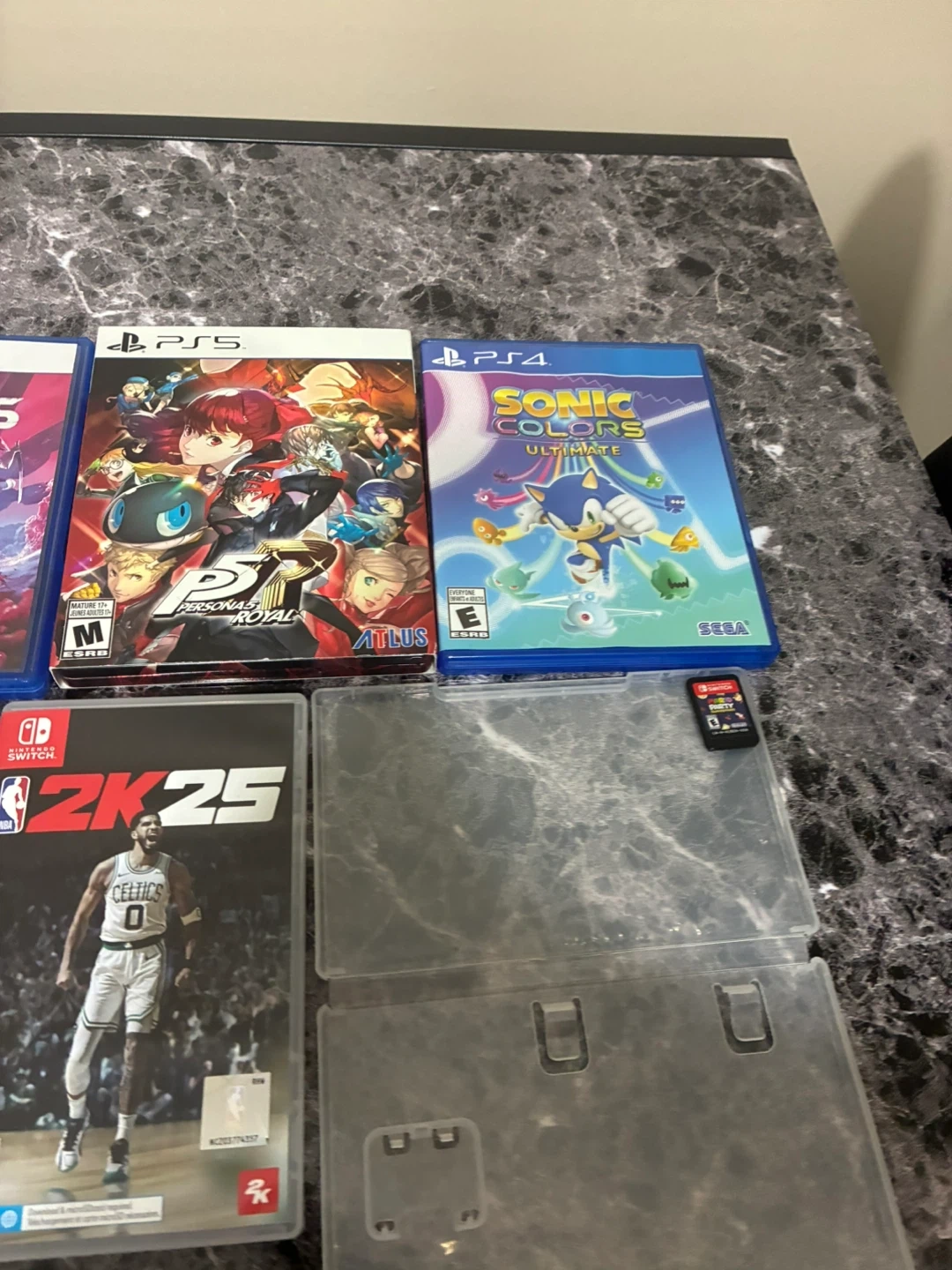 Bundle includes PS4 Spider-Man, PS5 Guardians of the Galaxy, PS5 Persona 5 Royal, PS4 Sonic Colors Ultimate, PS5 Spider-Man Miles Morales, NBA 2K23 for Switch, and NBA 2K25 for Switch. Also includes Mario Party Superstars for Switch. Cases are included for all games.