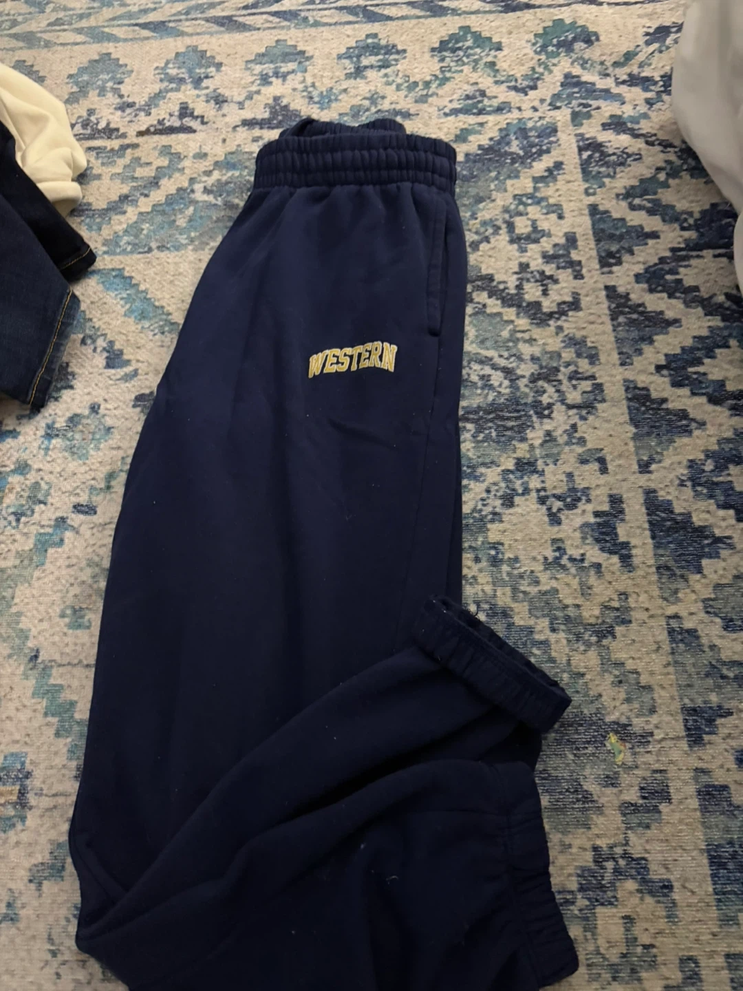 Comfy navy sweatpants with 'WESTERN' embroidered on the leg. Elastic waistband and cuffs for a good fit. These are great for lounging or casual wear.