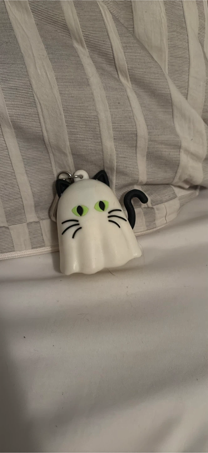 Cute ghost cat keychain. Features black cat ears and tail with green eyes and whiskers. Comes with a silver-toned keyring.