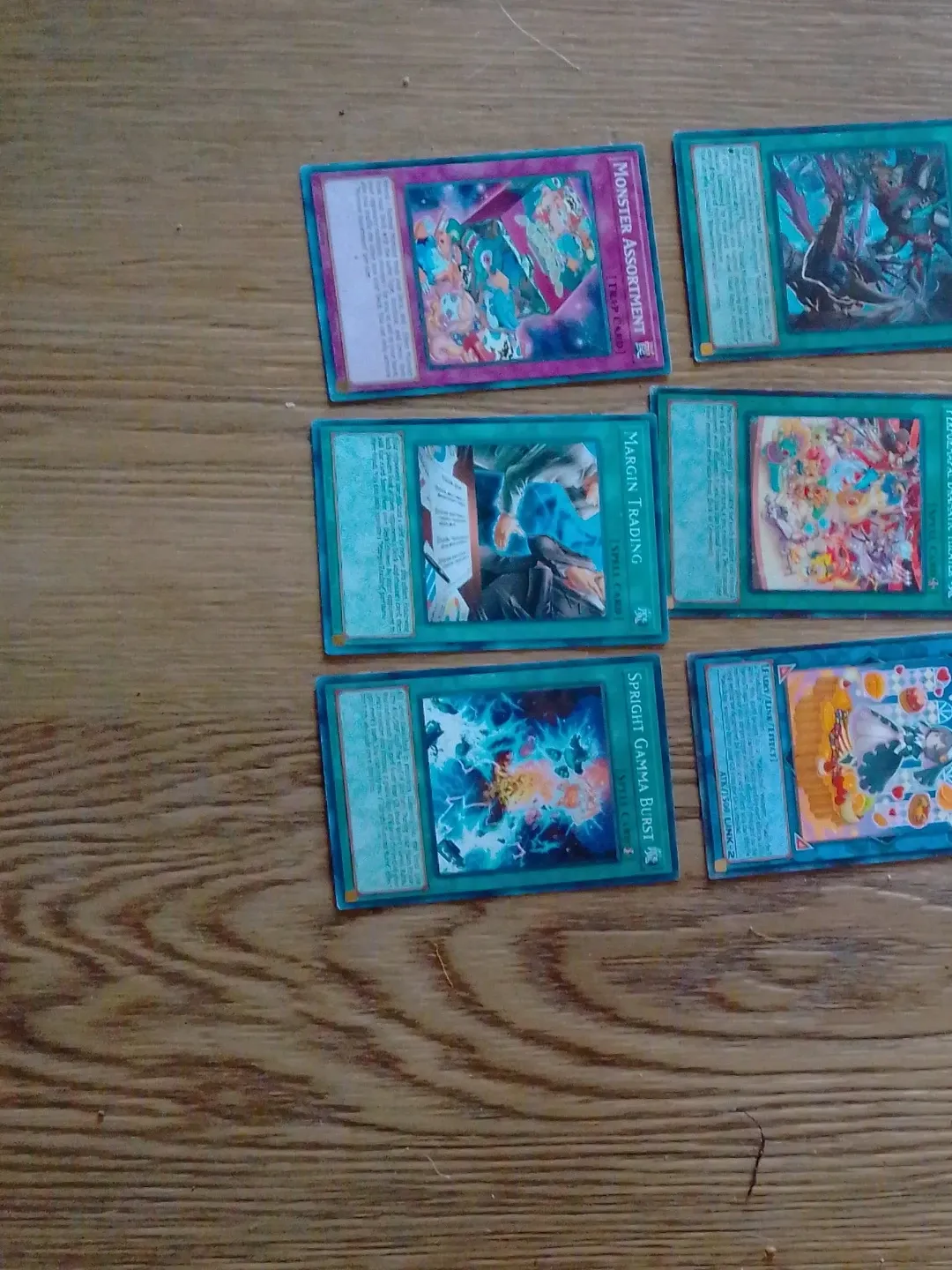 A collection of Yu-Gi-Oh! trading cards including Monster Assortment, Margin Trading, and Spright Gamma Burst. These cards are from the popular trading card game.