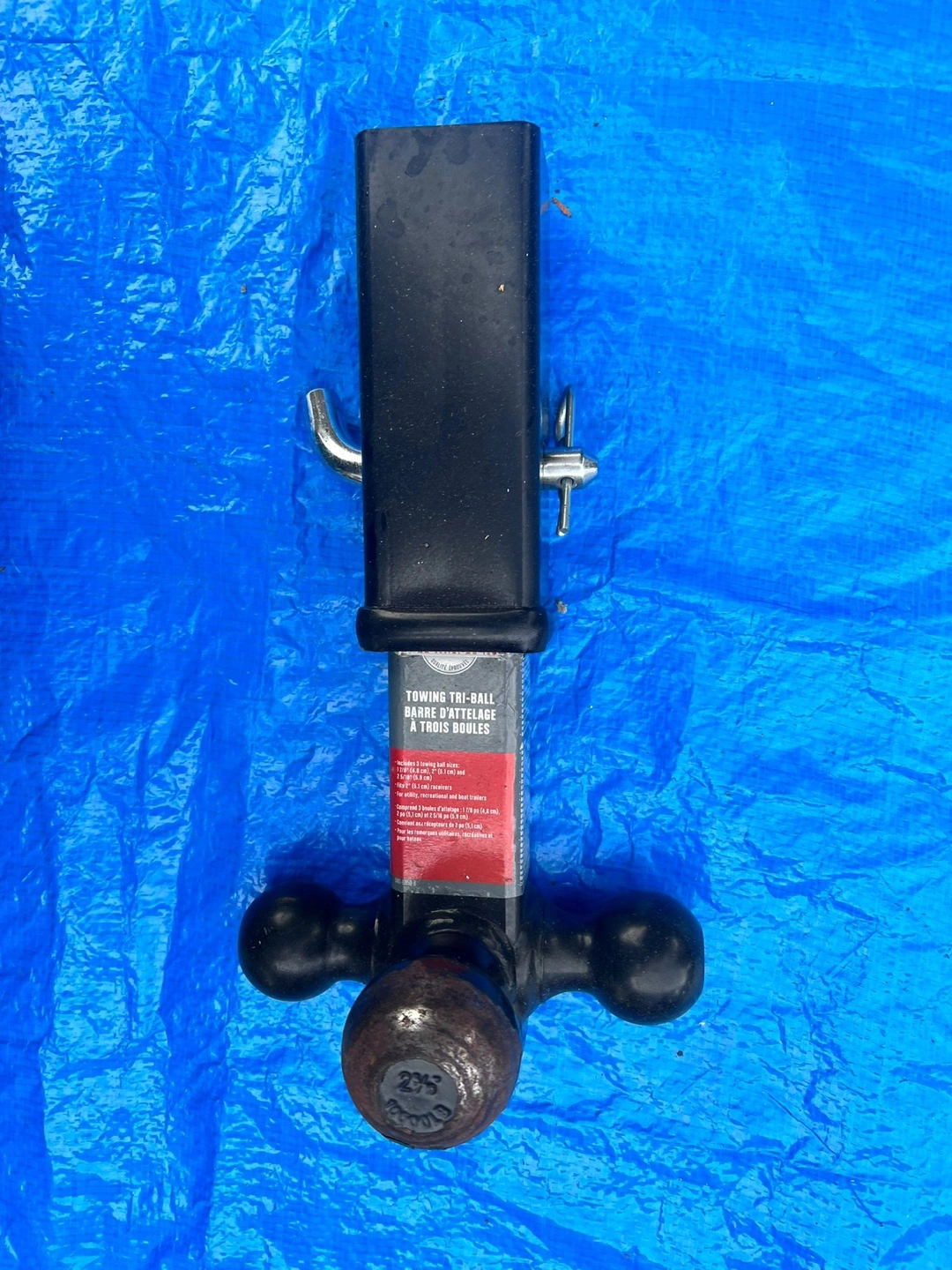 Heavy-duty towing tri-ball mount. Includes three ball sizes. Black powder-coated finish. Durable construction. Great for towing various trailers. With adpter