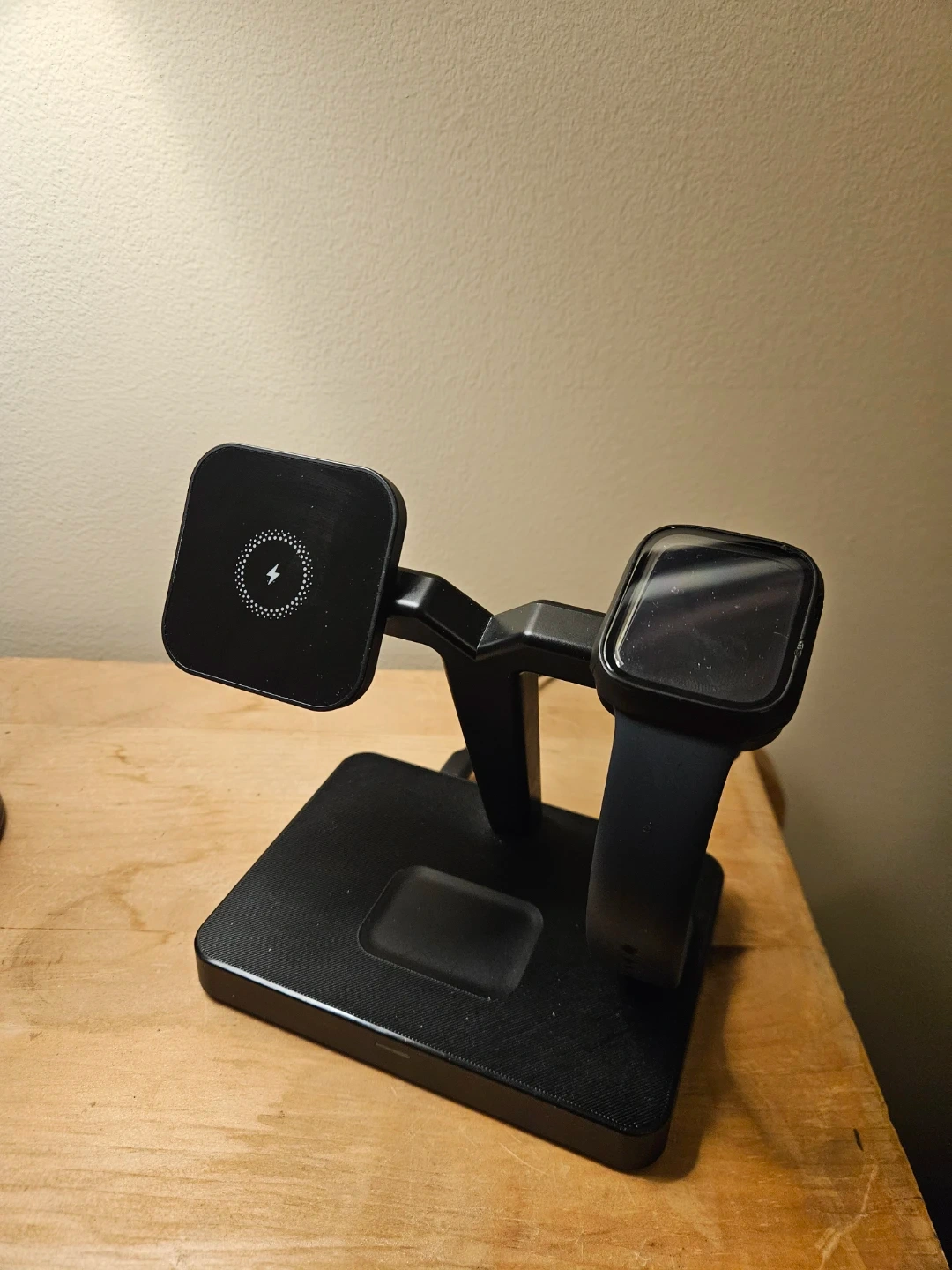 Black wireless charging stand. Charges phone, watch, and earbuds. Includes charging a charger cable. Keep your devices powered up and organized!