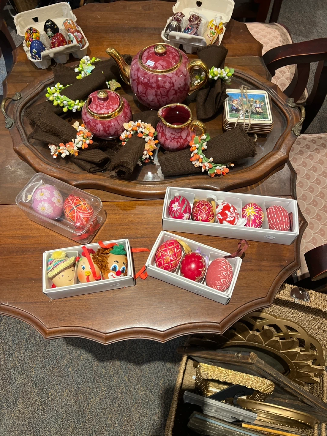 A collection of decorative Easter eggs in various styles and packaging. Includes painted eggs and eggs with intricate designs. Perfect for Easter display.