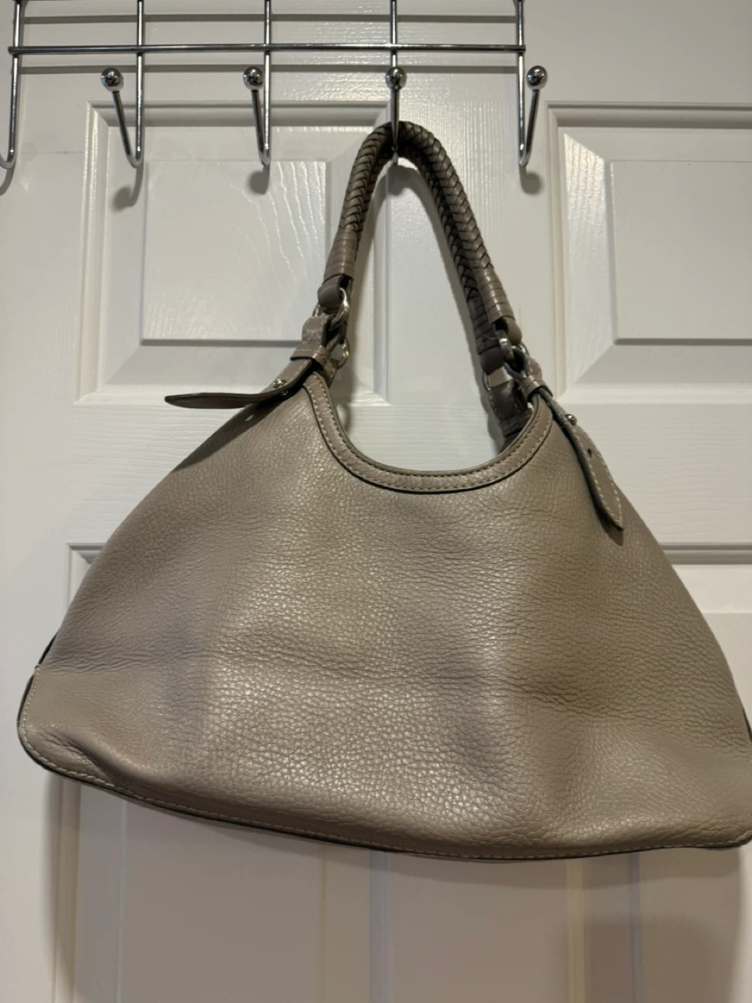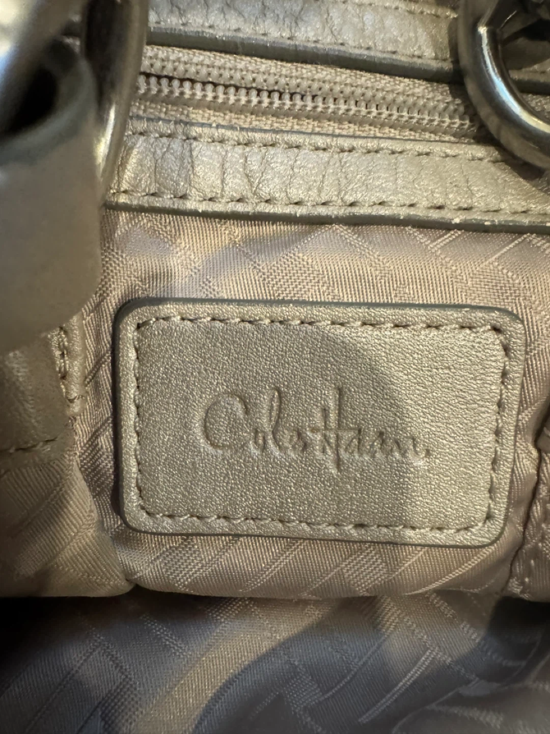 This is a stylish grey leather shoulder bag by Cole Haan. It features braided shoulder straps and silver-tone hardware. The interior lining is a contrasting fabric with the brand name subtly embossed. It's a versatile bag for everyday use.