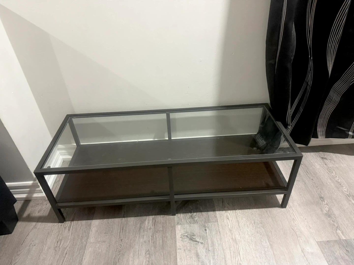 A sleek coffee table featuring a clear glass top and a dark wood shelf. It's got a sturdy metal frame. This table's design complements many living room styles. It's perfect for holding drinks, remotes, or decorative items.