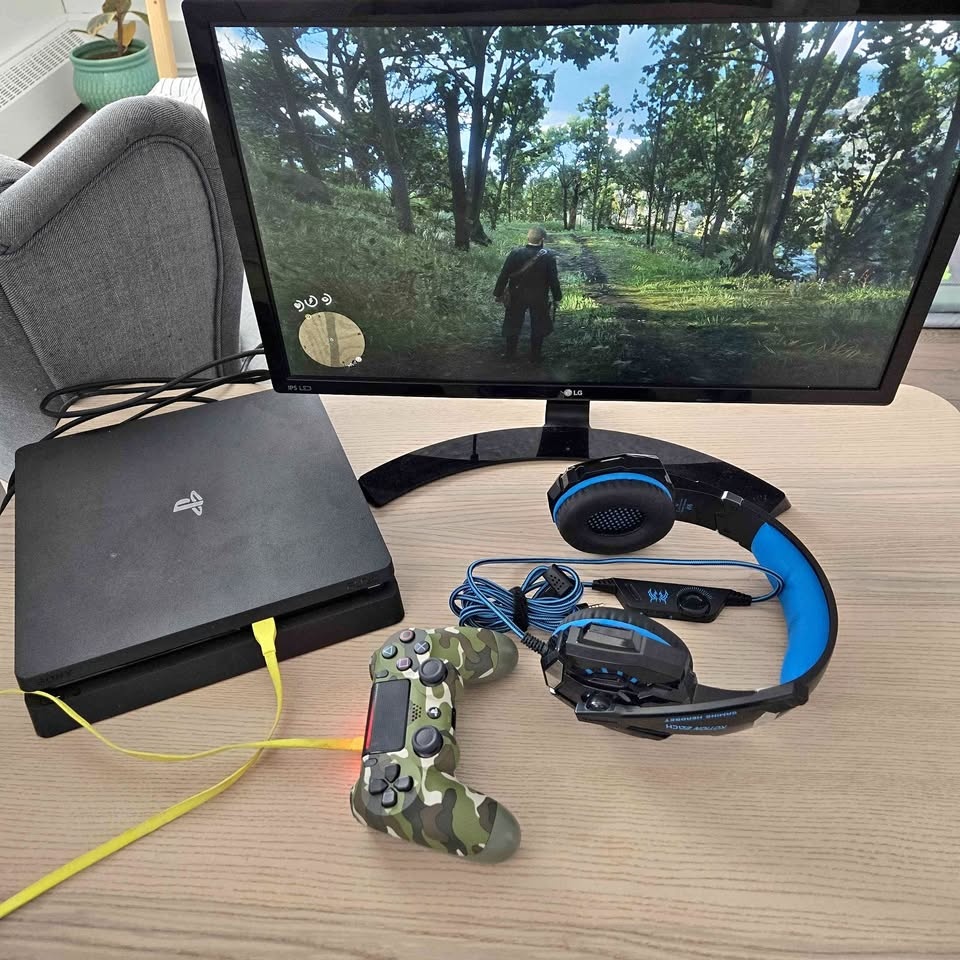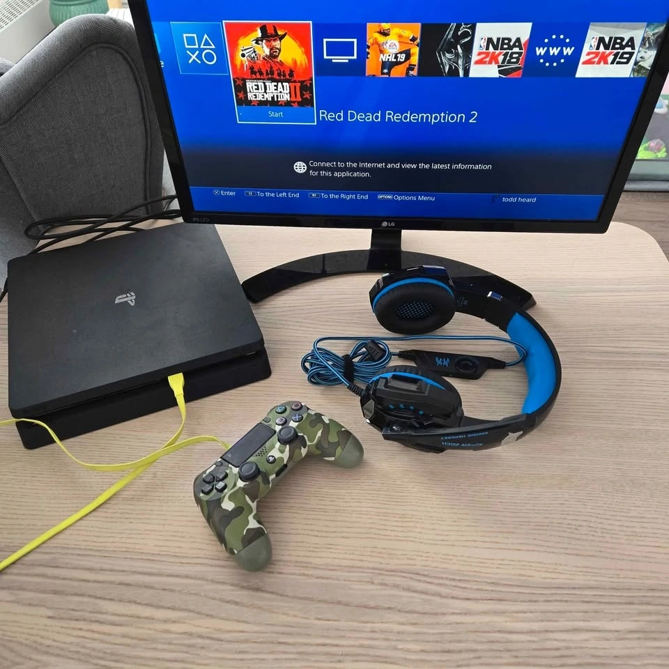 Pickup available in Etobicoke (451 The West Mall) or Brampton (10886 Hurontario). Price is firm. Includes games like Red Dead 2 and Skyrim, can be reset upon request. Everything works perfectly with no issues – no overheating, stick drift, noise, or dust. It's spotless and sanitized. Bundle includes: PS4 Slim 1TB with moddable 10.01 firmware, a good official controller with no issues, power cable, charge cable, and headset. Lots of other items in my listings.