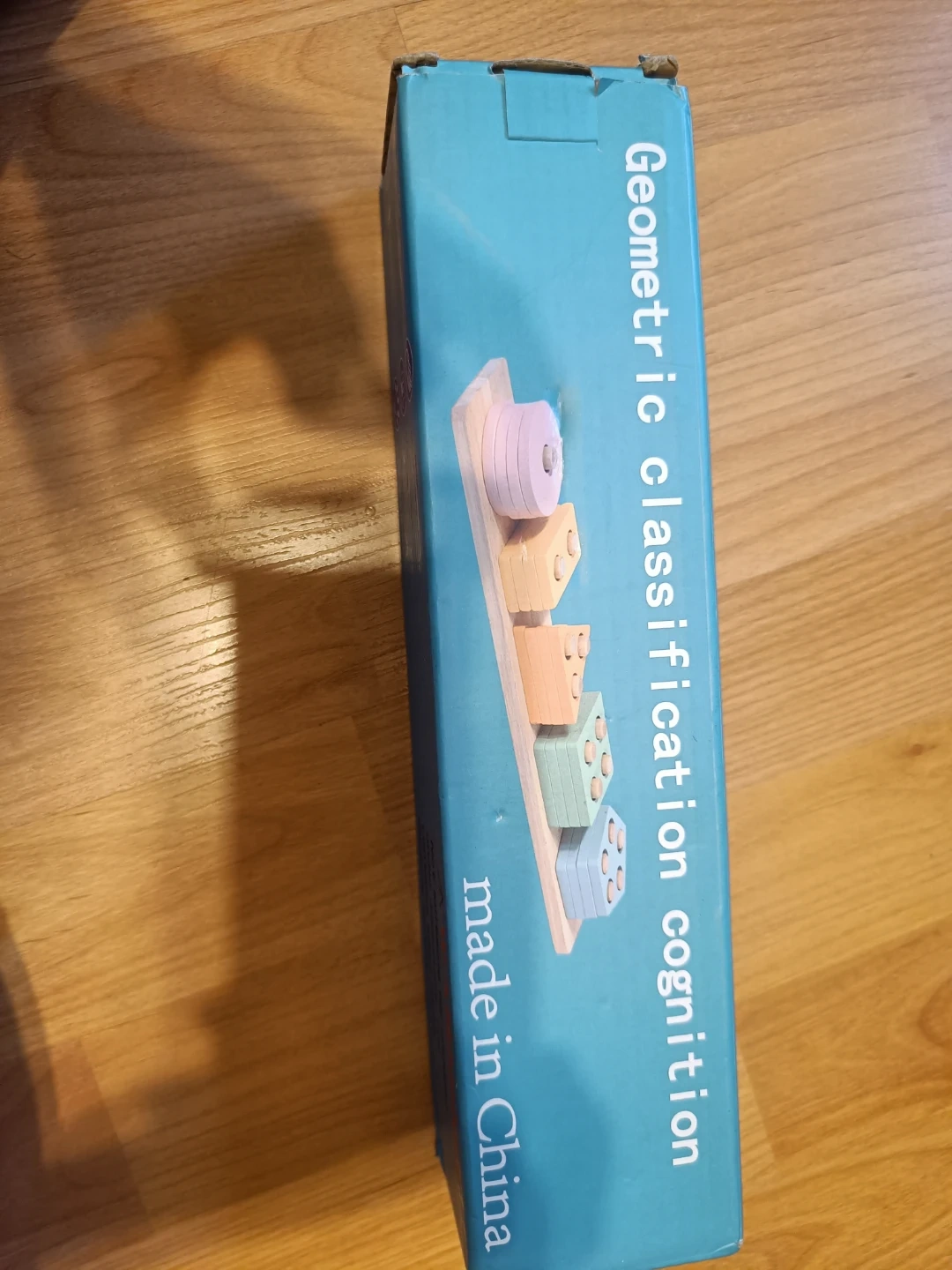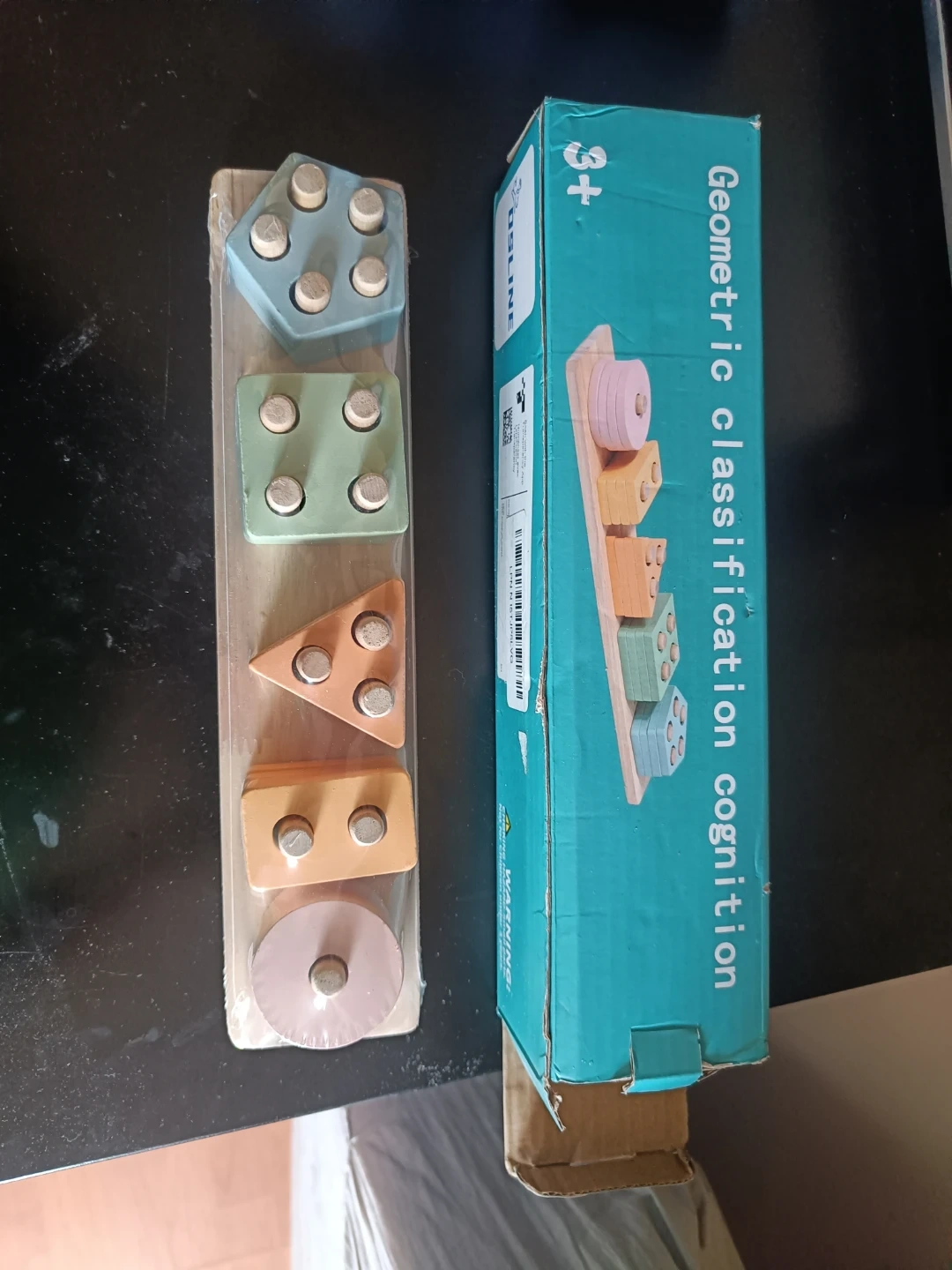 Wooden toy for ages 3+! It's a geometric shape sorter with five different shapes and colours. Includes original box.