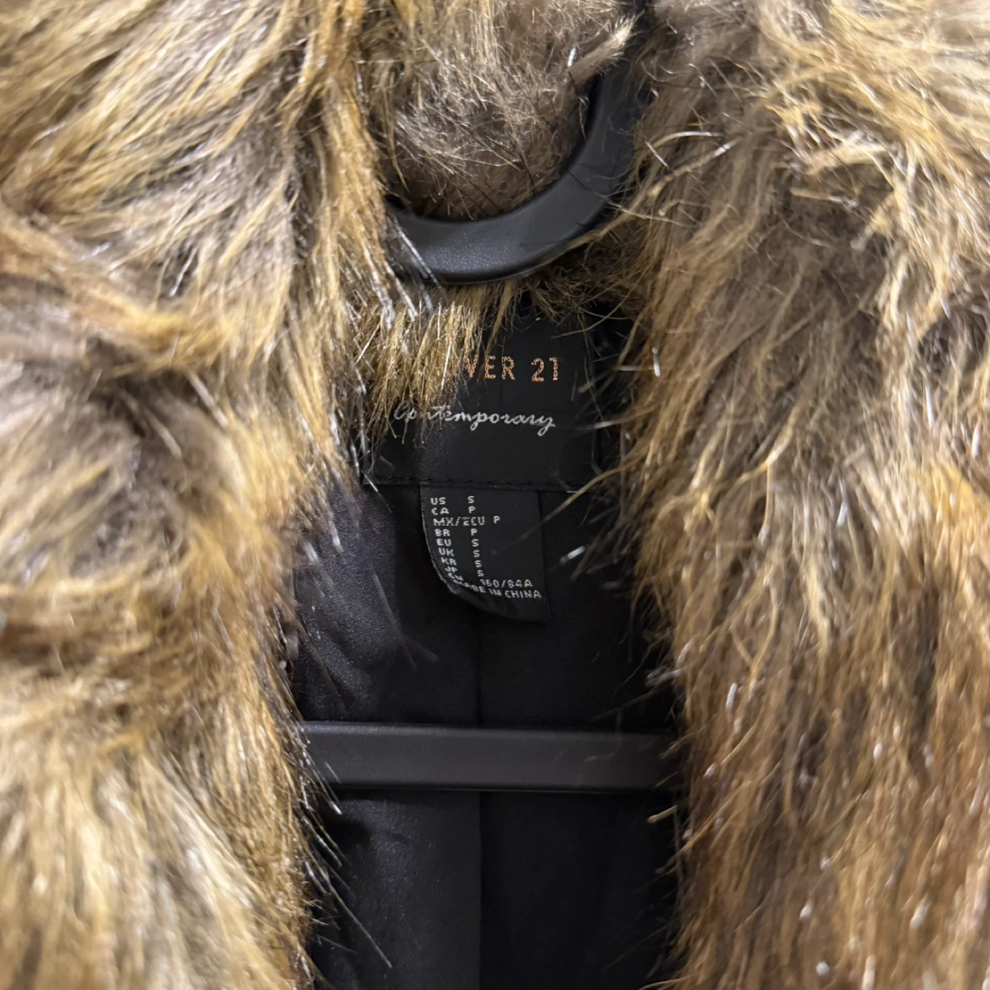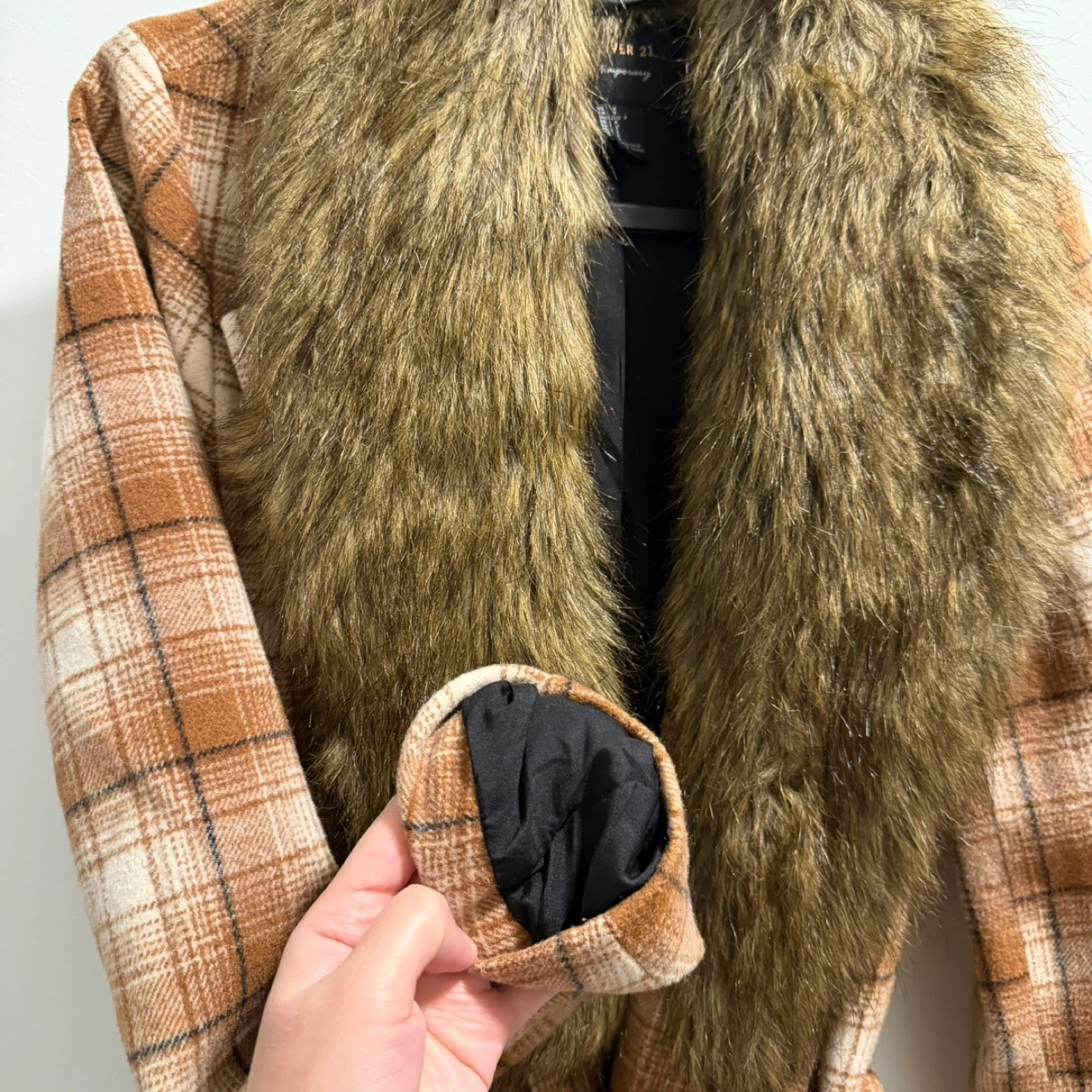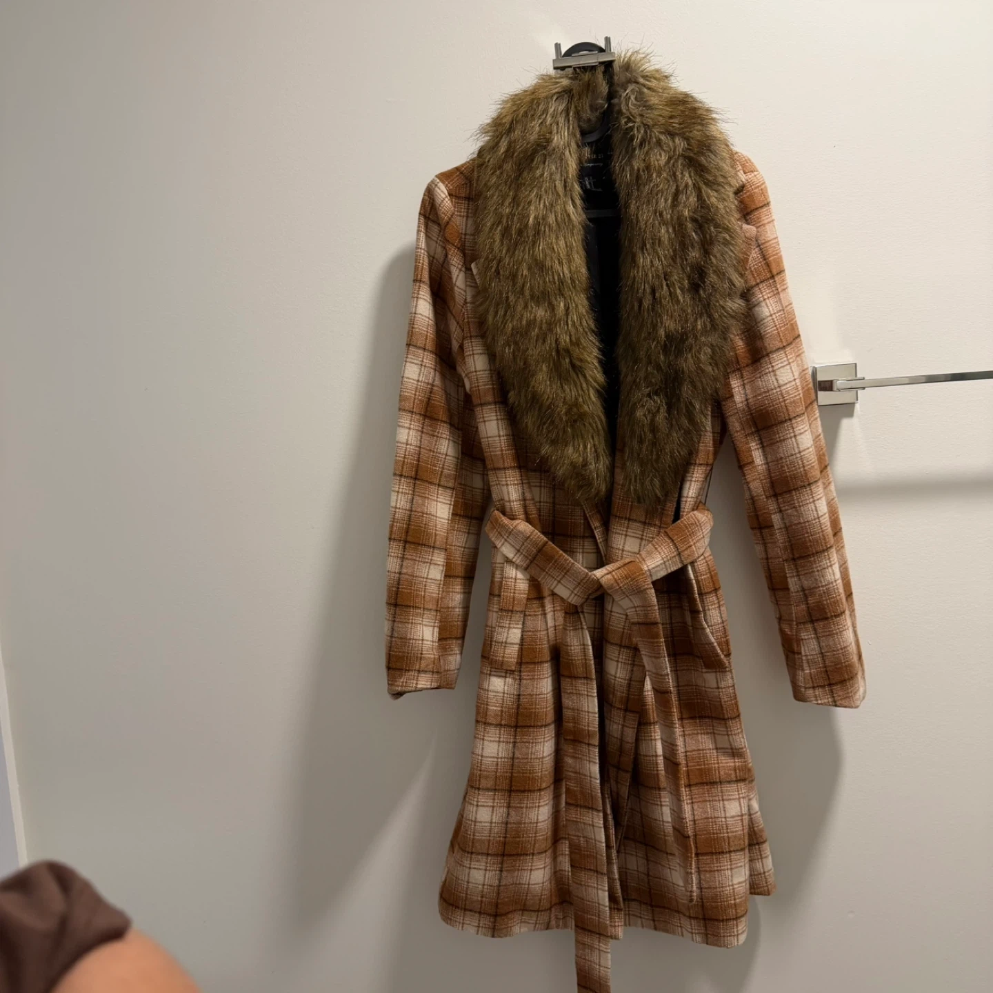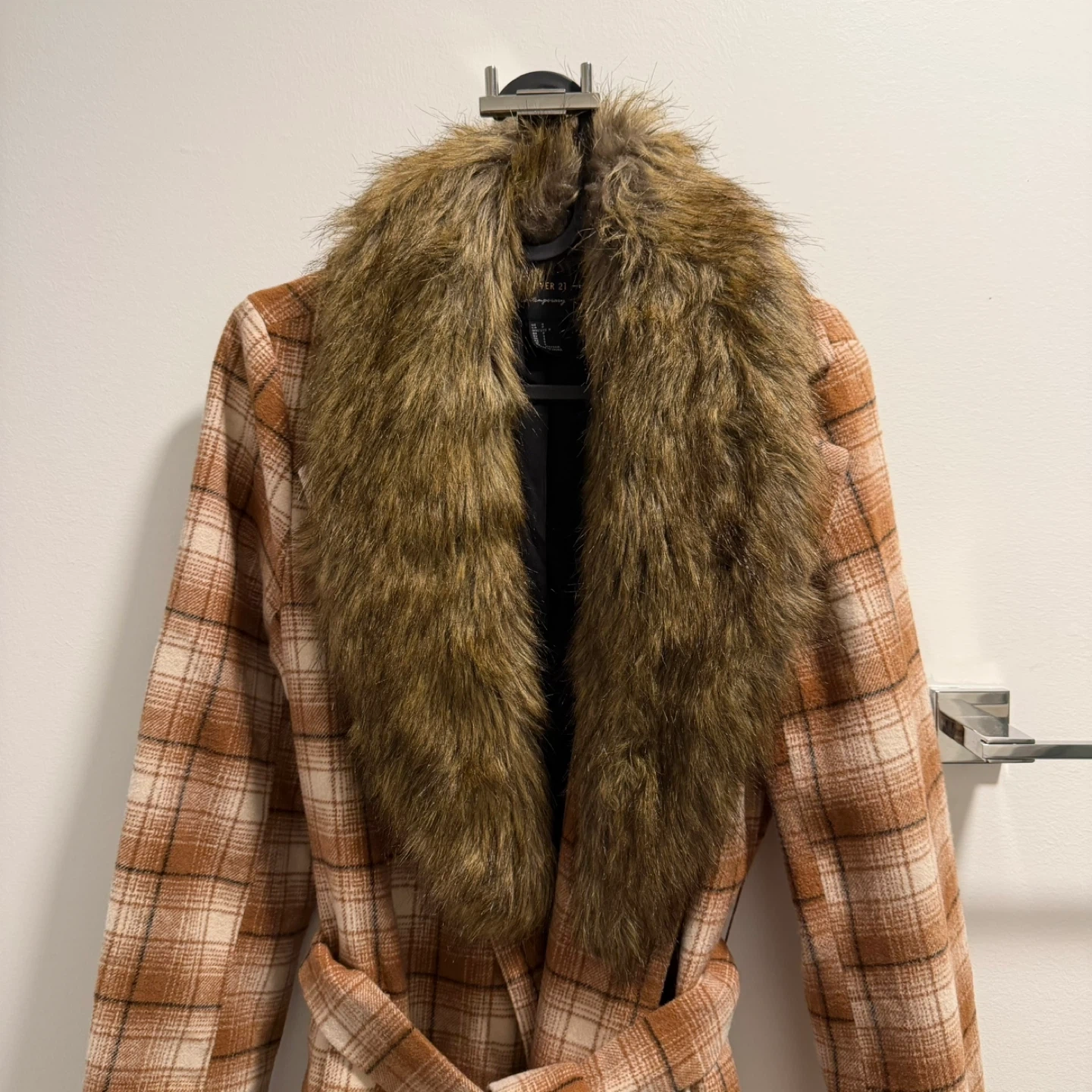 This Forever 21 coat features a stylish plaid pattern and a cozy faux fur collar. It's a size small and includes a matching belt. Perfect for cooler weather!