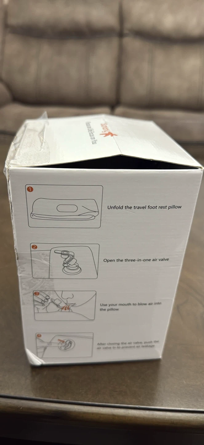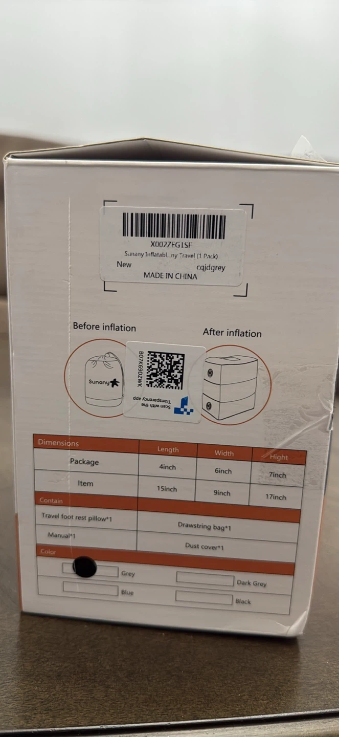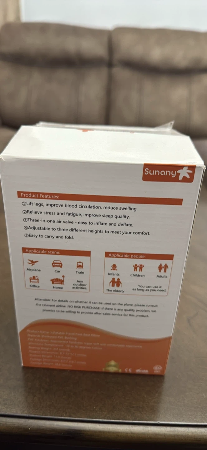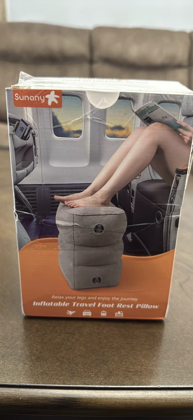 I have a brand new Sunany inflatable travel foot rest pillow for sale! It's great for airplanes, cars, trains, offices, and even at home. It's adjustable to three different heights to meet your comfort needs, and it's easy to carry and fold. The package includes the travel foot rest pillow, a drawstring bag, and a dust cover. The item measures 15 inches in length, 9 inches in width, and 17 inches in height