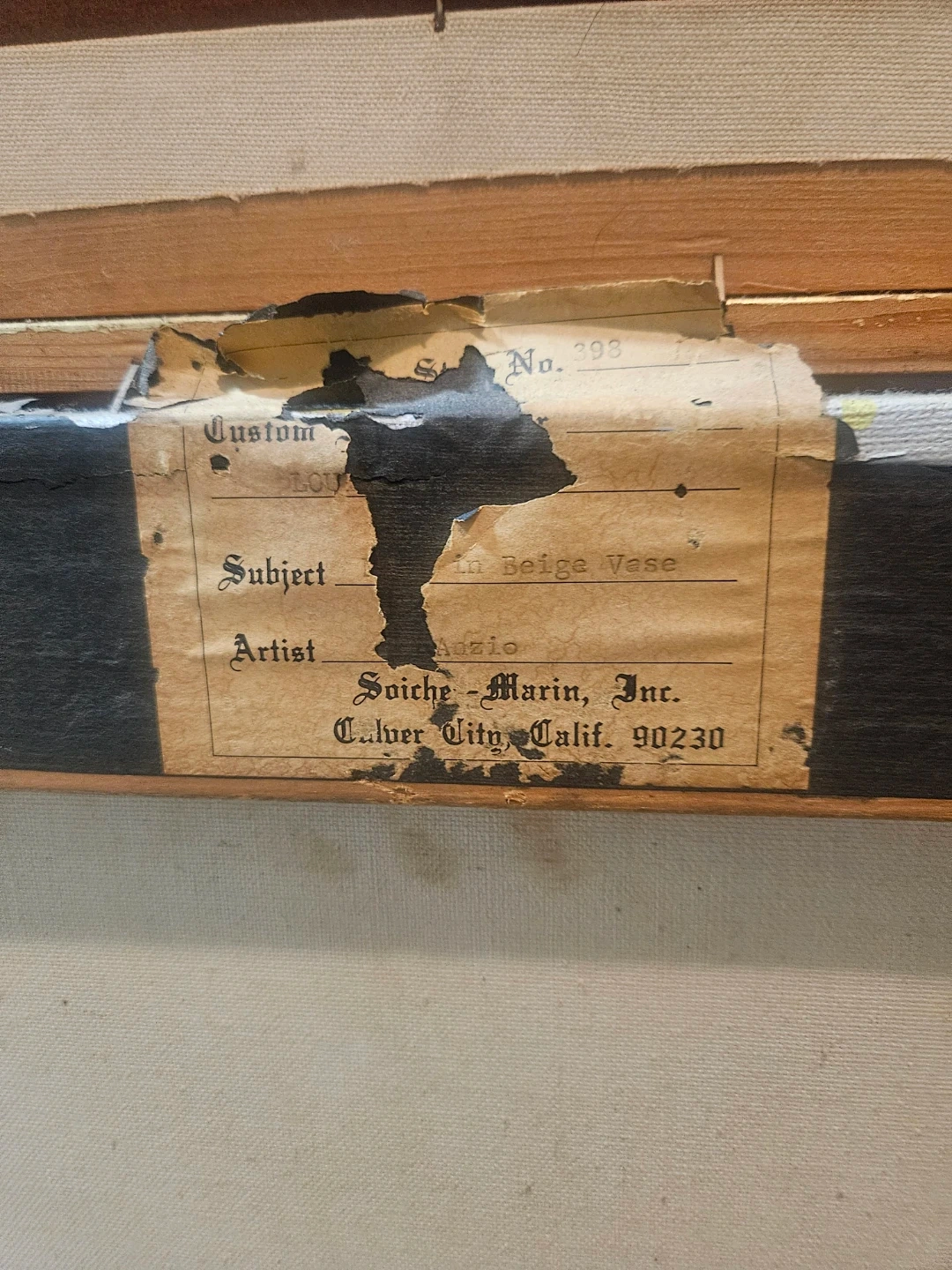 This is an original oil painting depicting flowers in a beige vase. It's framed and ready to hang. The artwork is signed by the artist and was custom framed in Culver City, Calif. It's a beautiful piece that would add color to any room! SIGNED. d.anzio. 37.5" x 38.05"