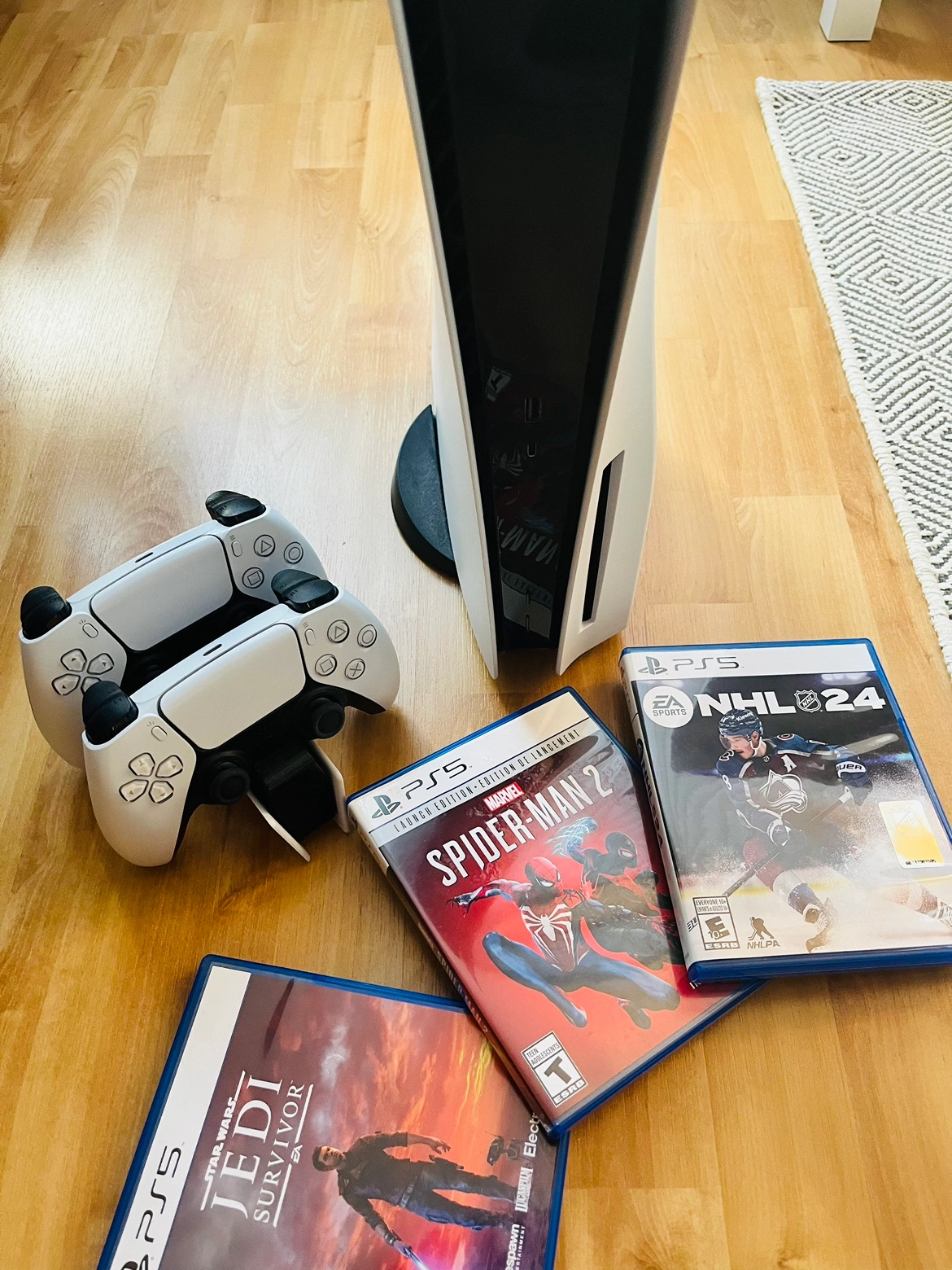 Includes console, ONE controller, controller charging stand and three games: Marvel's Spider-Man 2, NHL 24, and Star Wars Jedi: Survivor. Complete with box.
