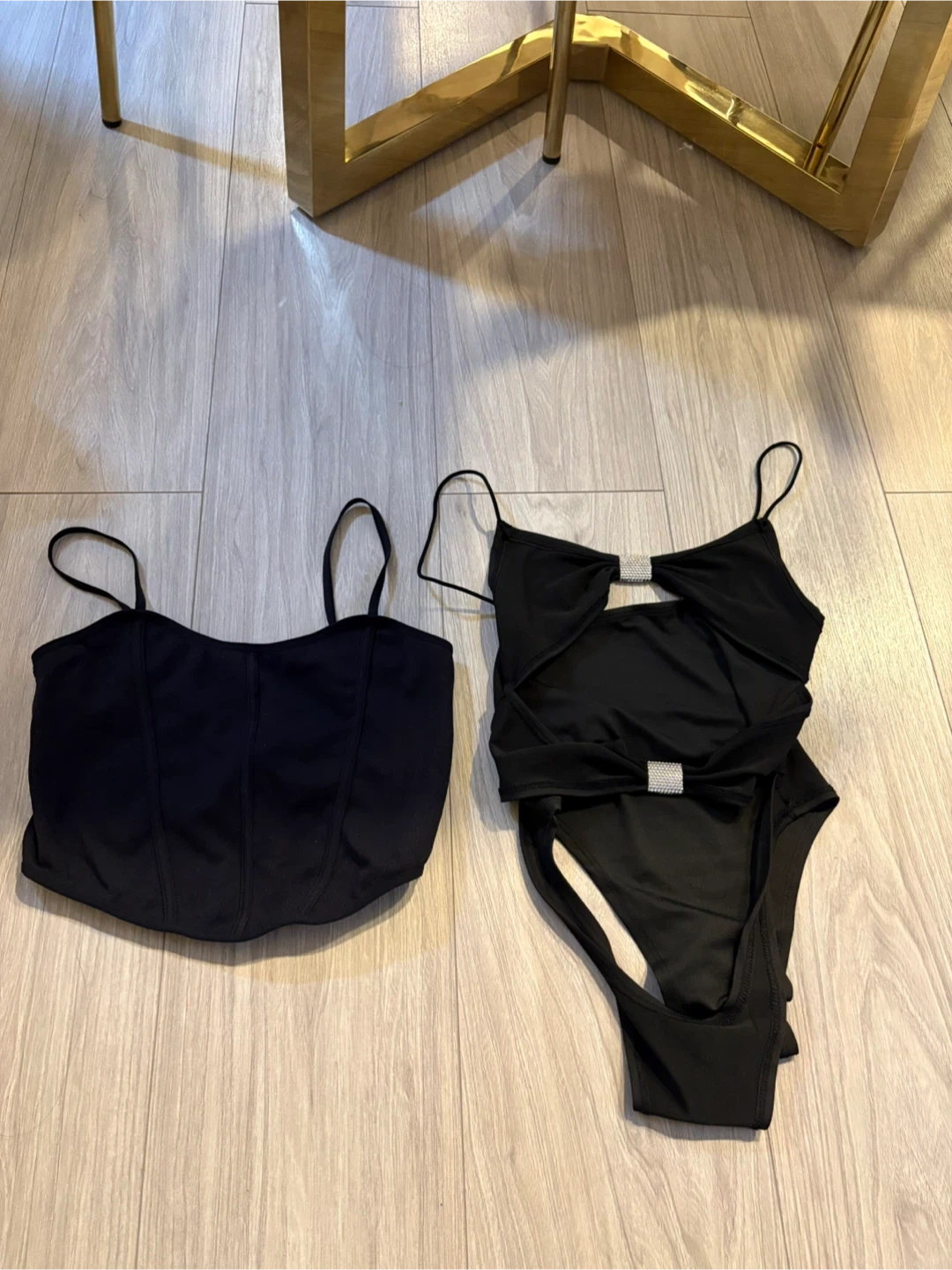 This set includes a black corset-style top and a matching black one-piece. The one piece features cut-outs and a decorative jeweled accent at the bust. Both items are made of a stretchy, black fabric. Great for a night out!