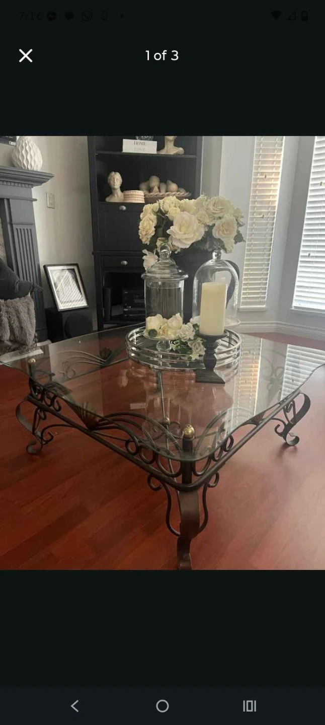 A beautiful accent table with a clear glass top and ornate metal scrollwork base. It's perfect for adding a decorative touch to any room. The table has a compact size suitable for placing next to a sofa or chair.