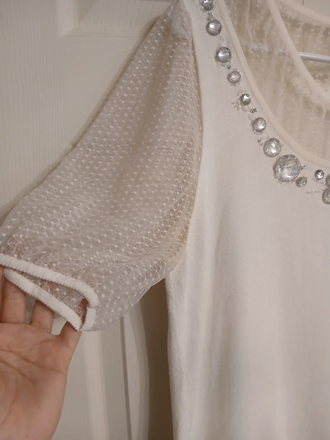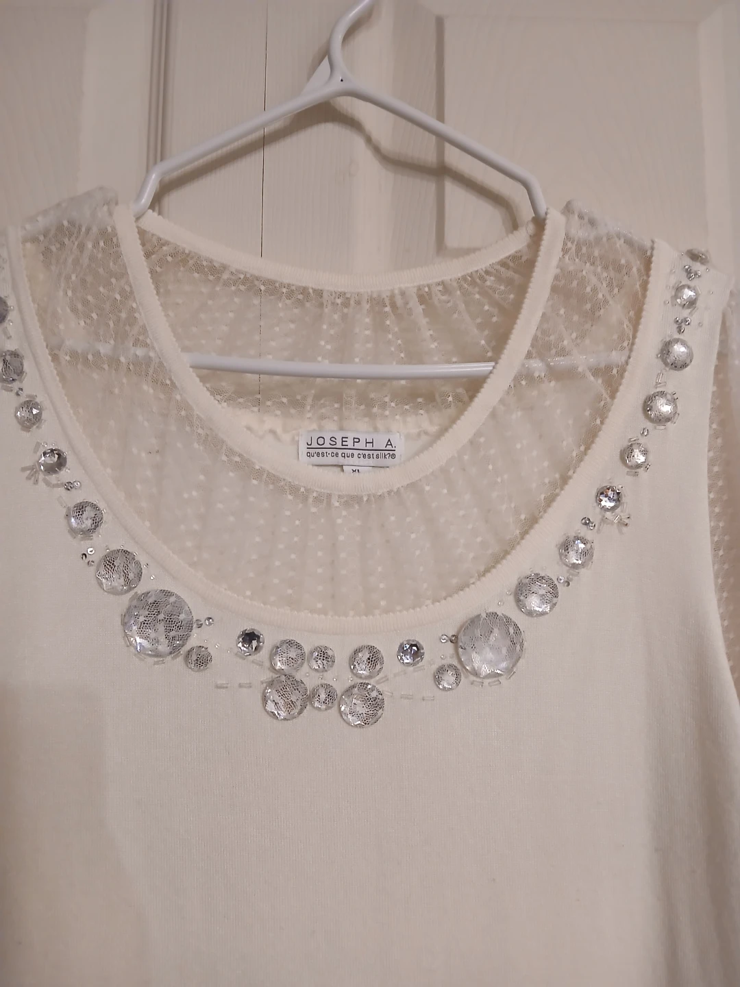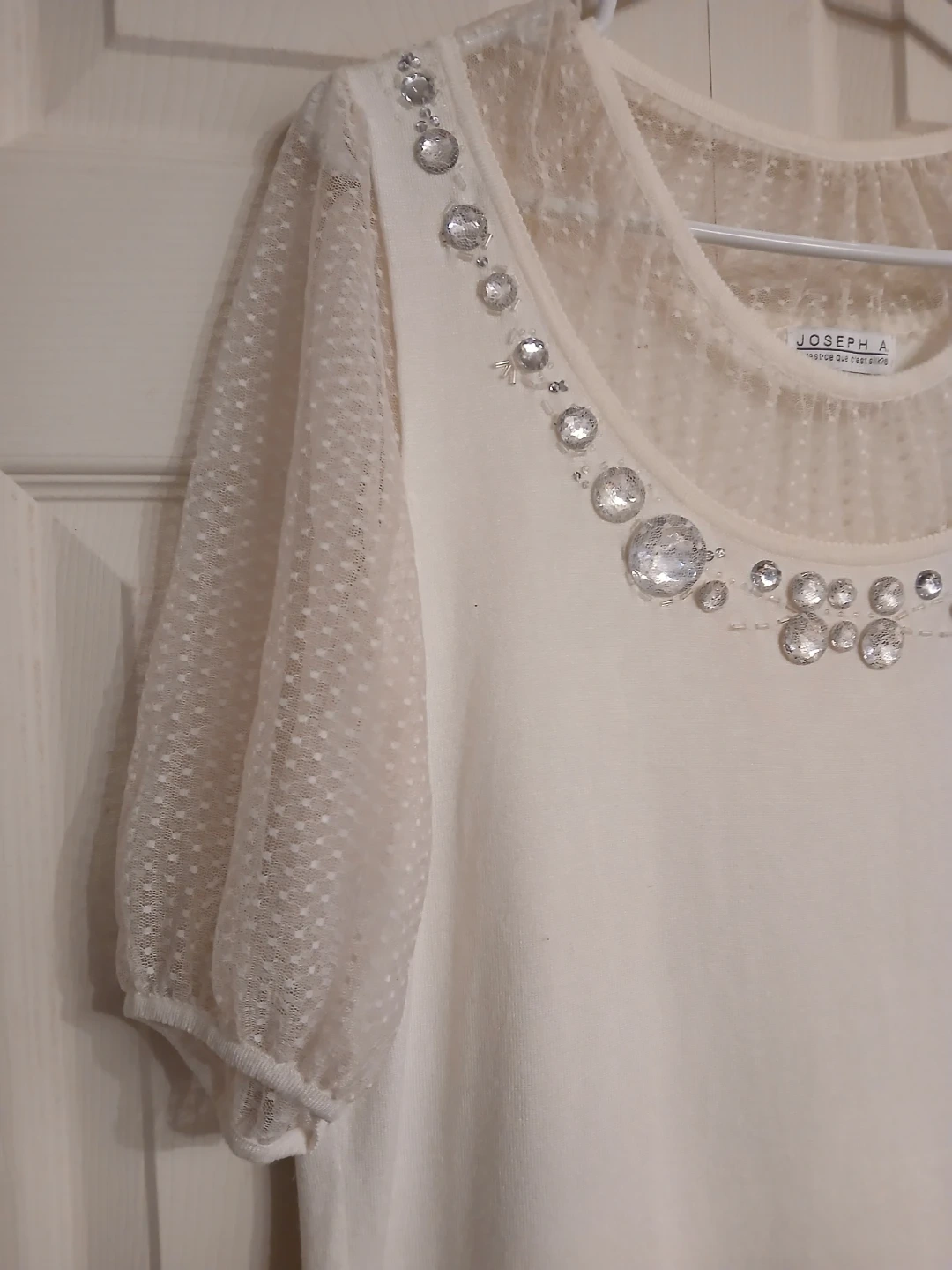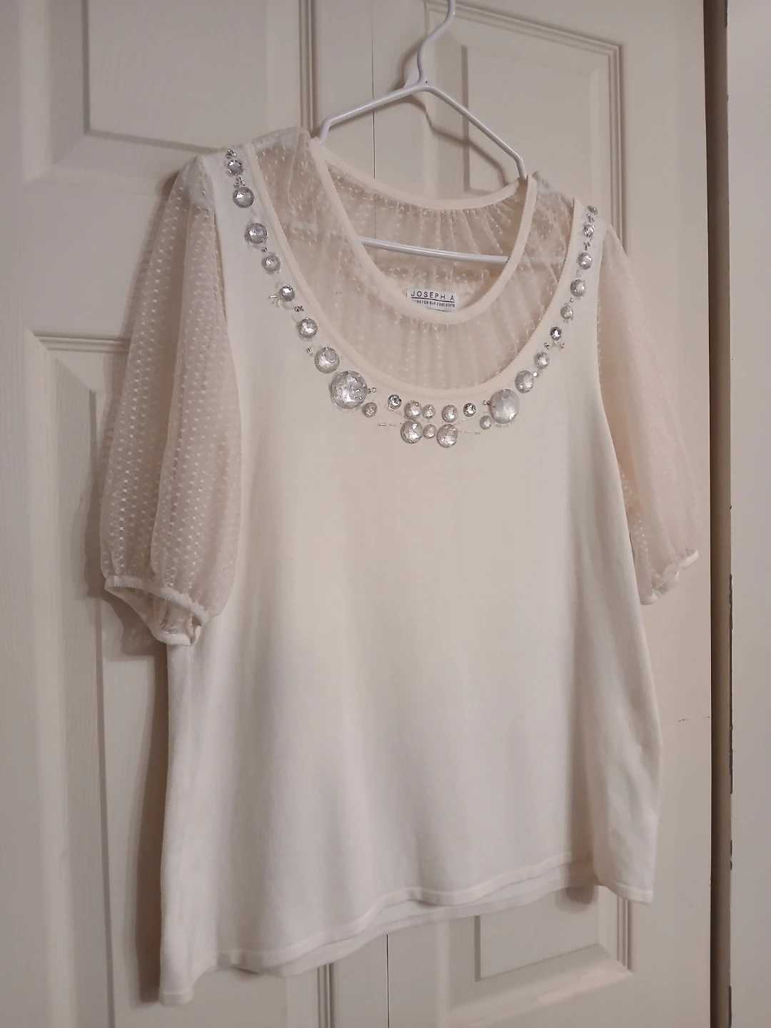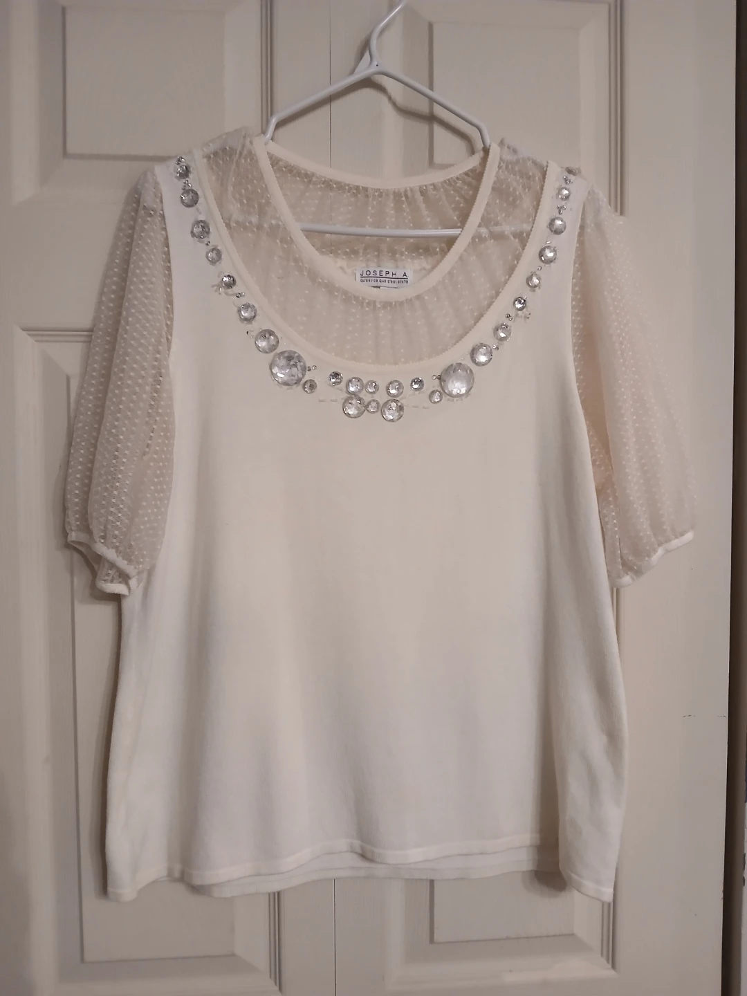 Joseph A blouse in soft cream. Scoop neckline trimmed with large crystal jewels. Sheer dotted mesh short sleeves. Smooth, flowing knit body. Feminine and dressy look.