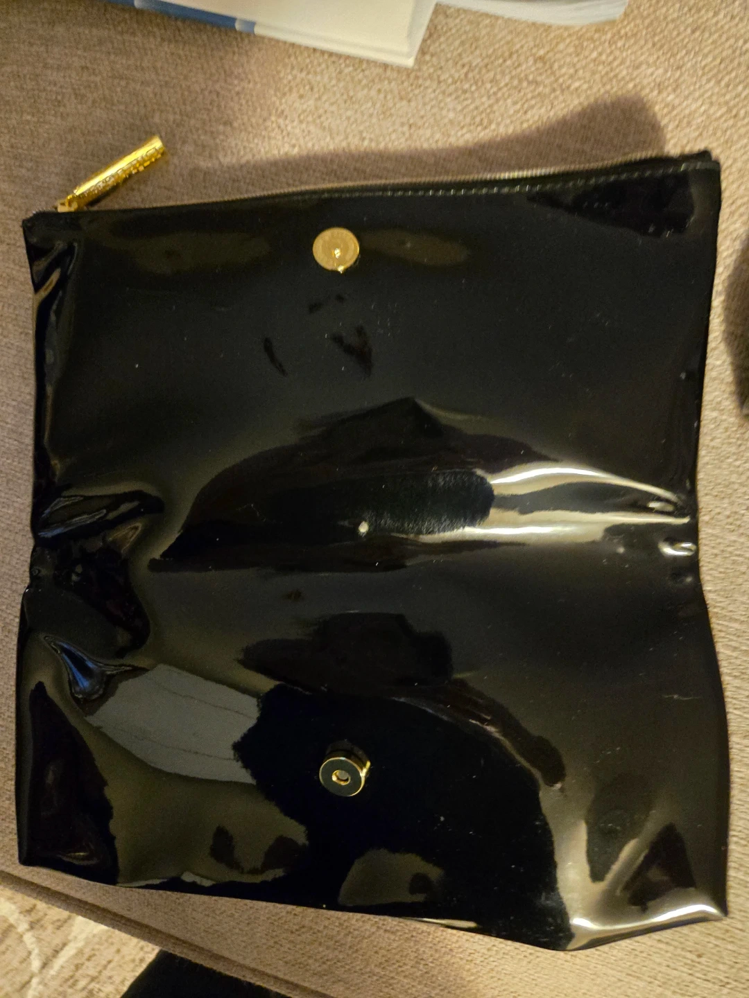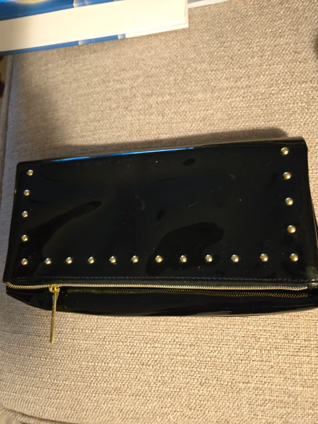 Estee Lauder Shiny black patent clutch with gold stud accents. It has a zip closure and a magnetic snap button inside. Perfect for carrying essentials for a night out!
