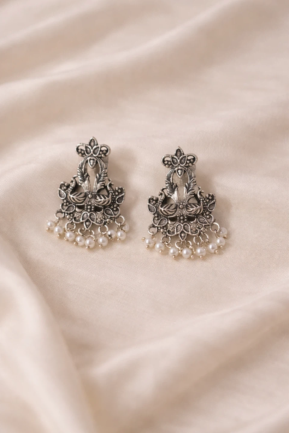 Oxidized Silver Jhumka Earrings with Pearl Dangles