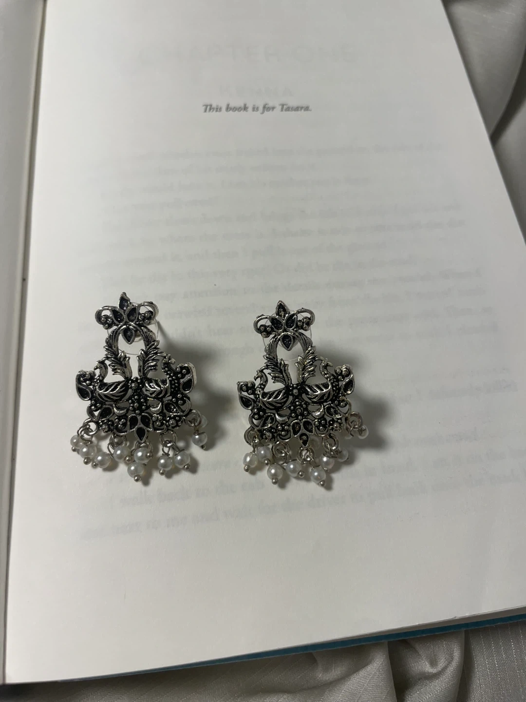 These beautiful oxidized silver jhumka earrings feature intricate detailing and delicate pearl dangles. They're a stunning accessory for any traditional or modern outfit! The earrings are crafted from a silver-toned metal and adorned with small white pearls.