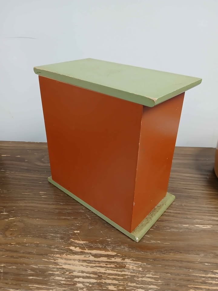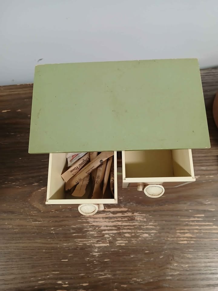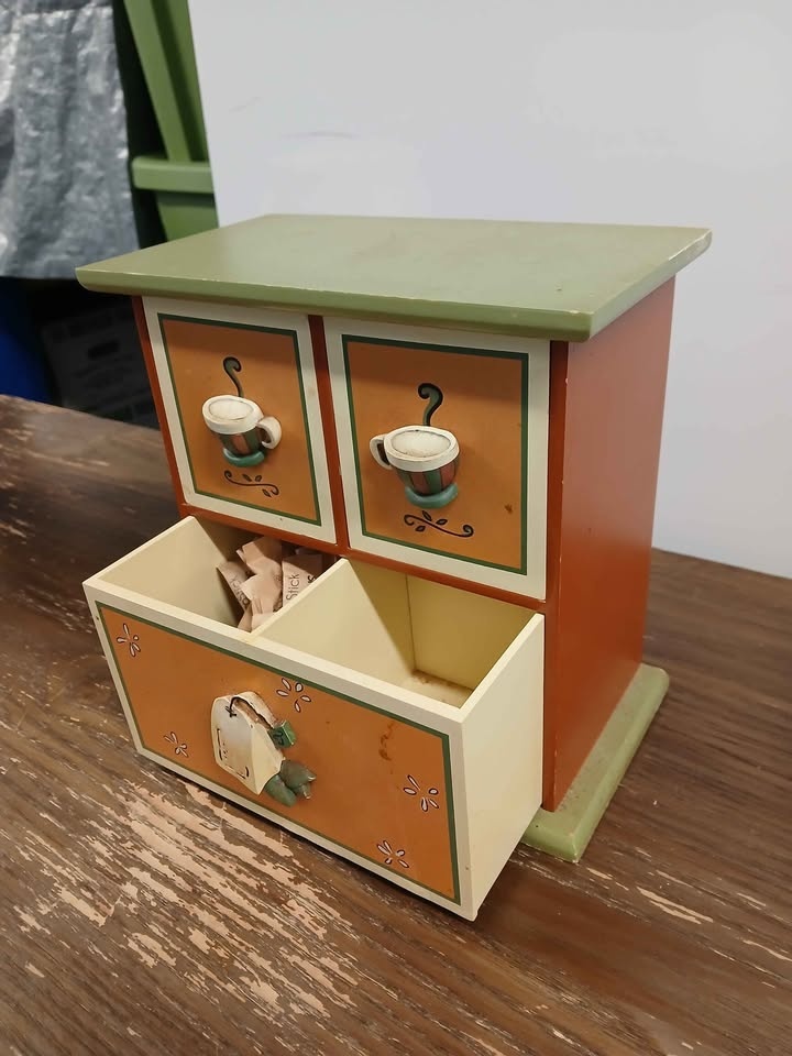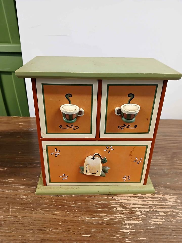Cute little storage unit for kitchen or desk. Has coffee and tea designs on the drawers. Good for tea bags, sugar packets, or other small items. Green top and base with orange and reddish-brown sides. Two small drawers on top, one wider drawer on bottom with divider.