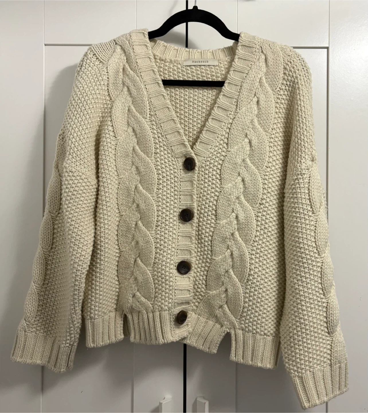 Cozy cream cable knit cardigan from Hackesch. It's size is M.