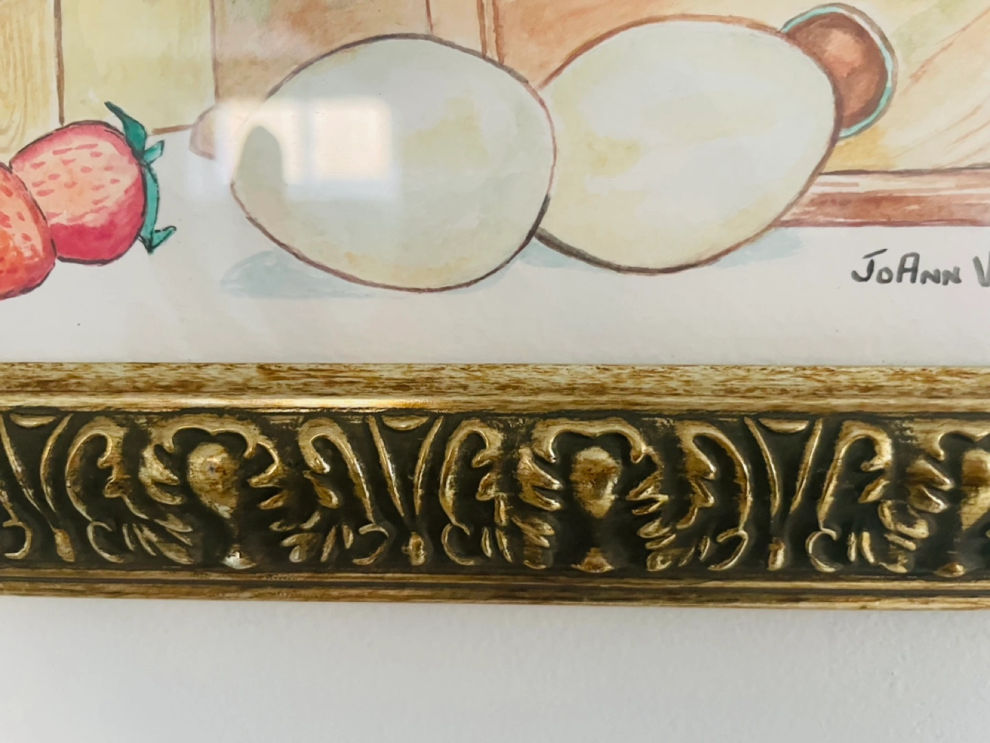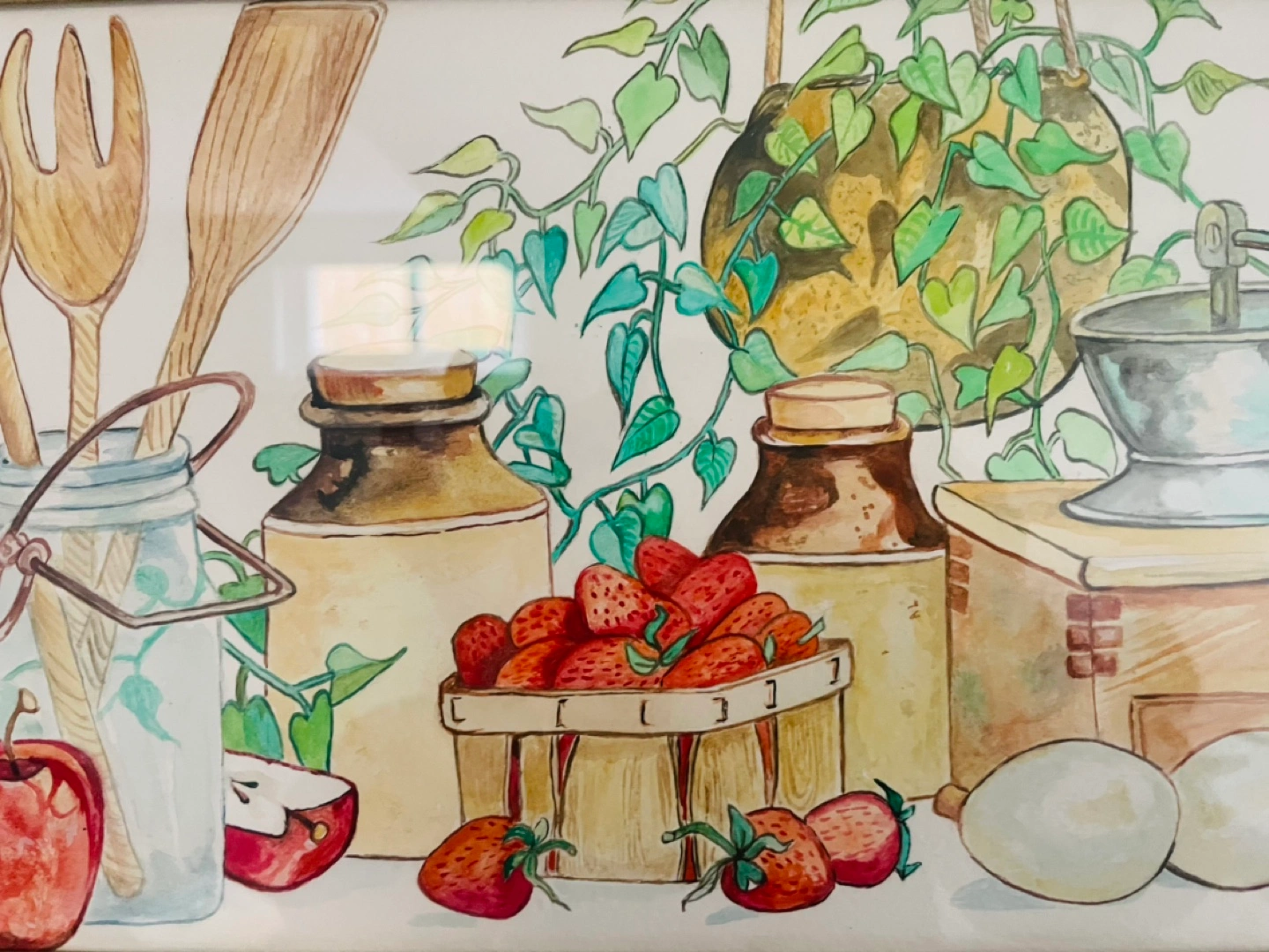 Lovely watercolor painting, kitchen theme. Features strawberries, apples, crocks, wooden utensils, and a coffee grinder. Ornate gold frame. Artist signature visible.
