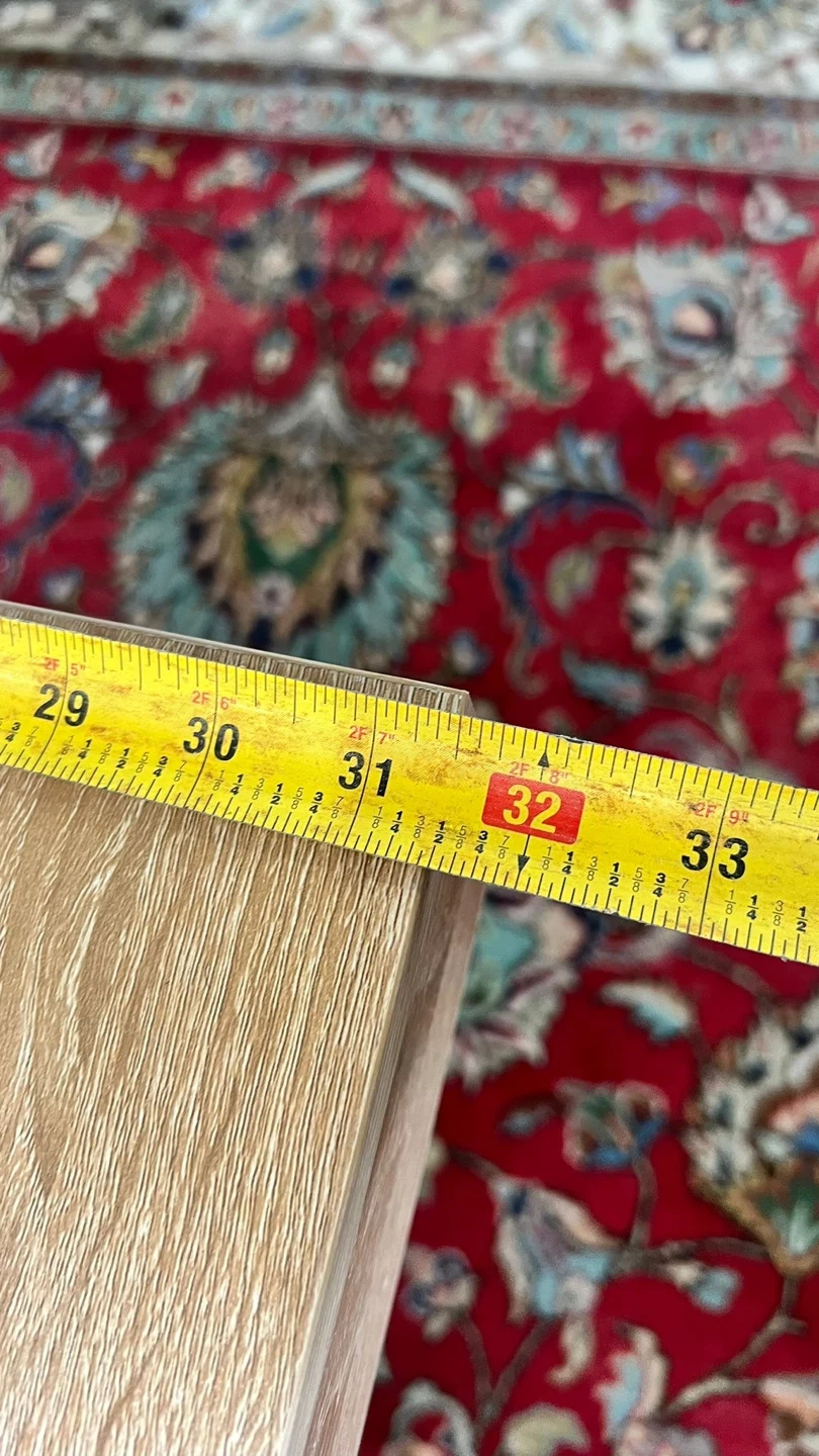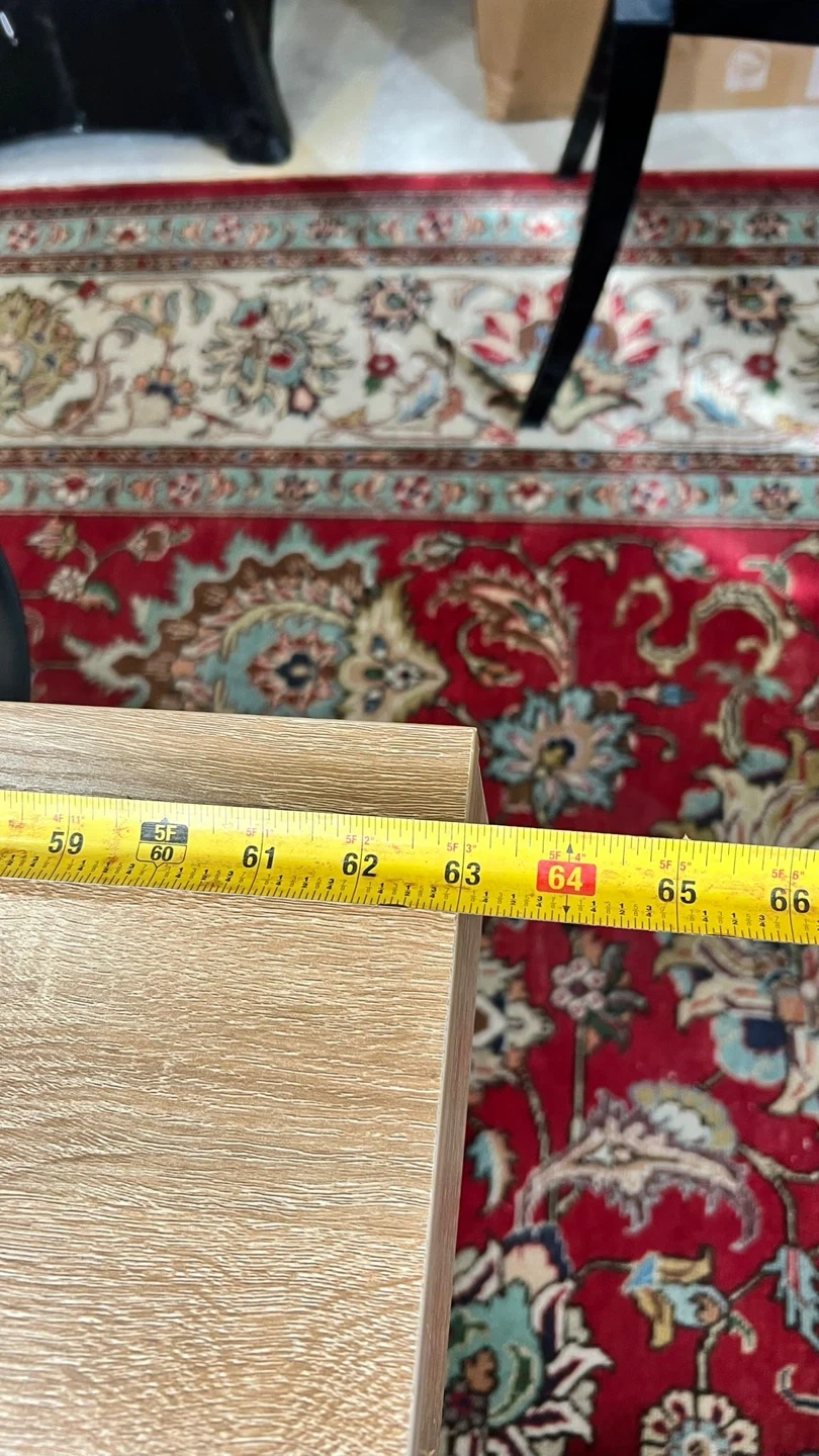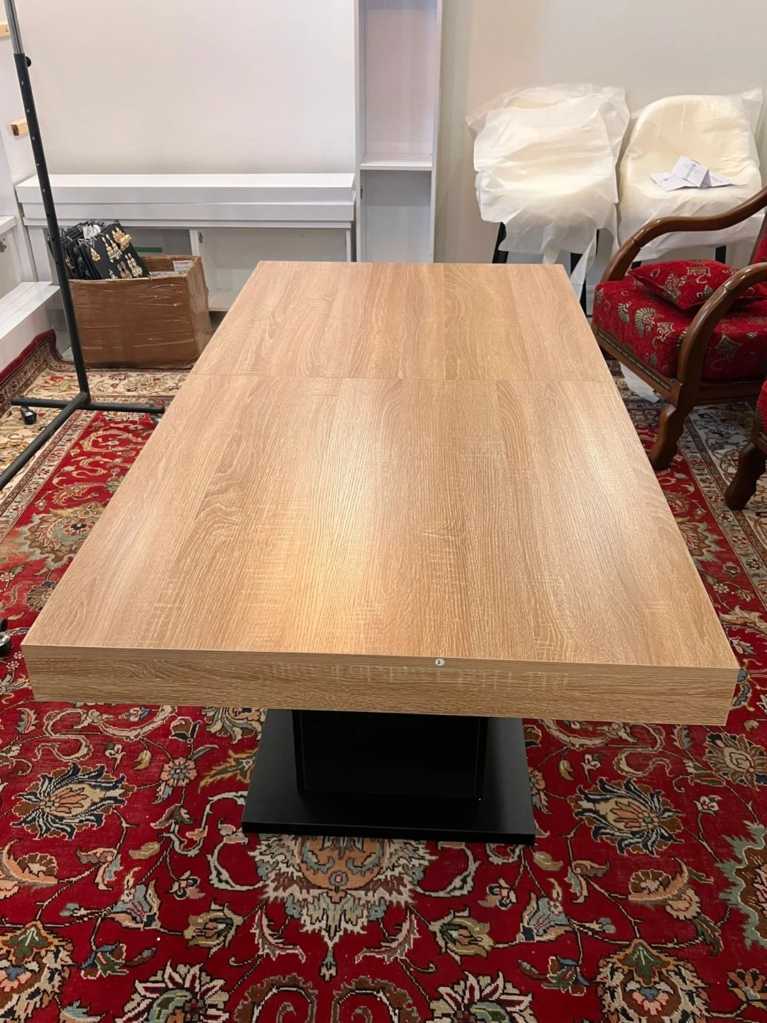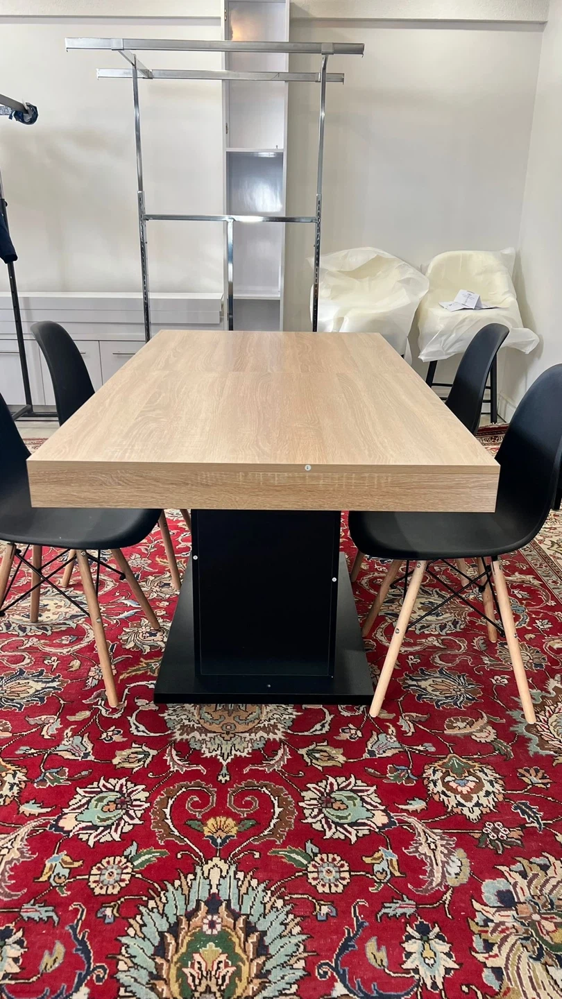 This is a dining table with a wood grain finish. It's designed with a modern, clean aesthetic. The surface is durable and easy to clean.