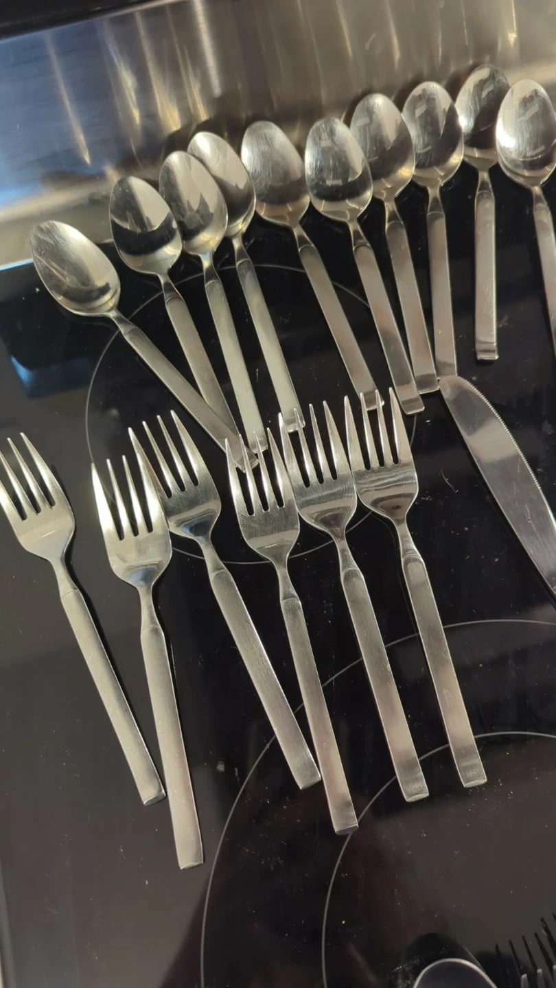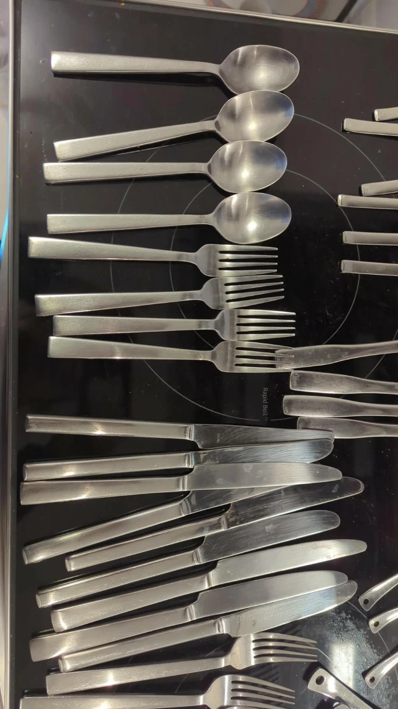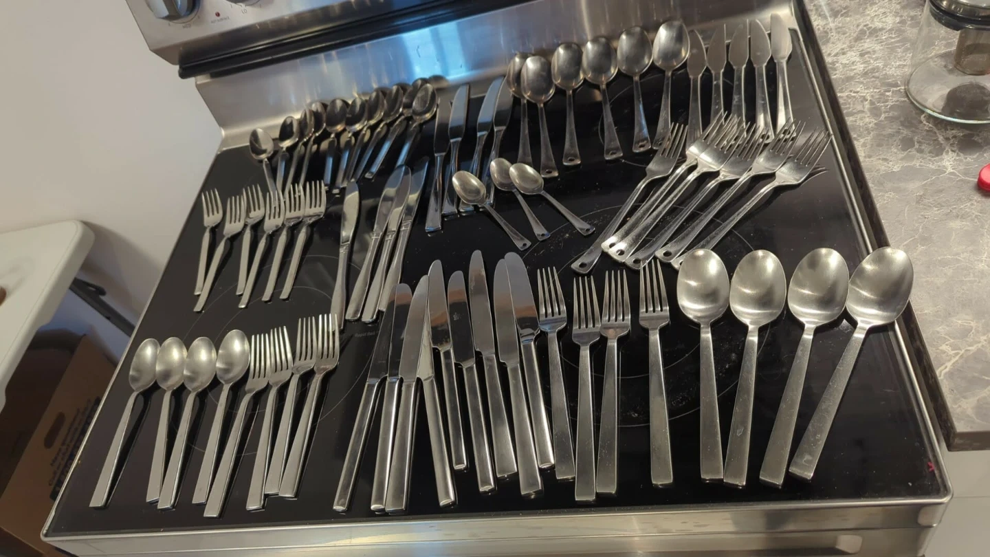 22 butter knives, 14 dinner spoons, 14 dinner forks, six dessert forks, three mini spoons, 10 dessert spoons