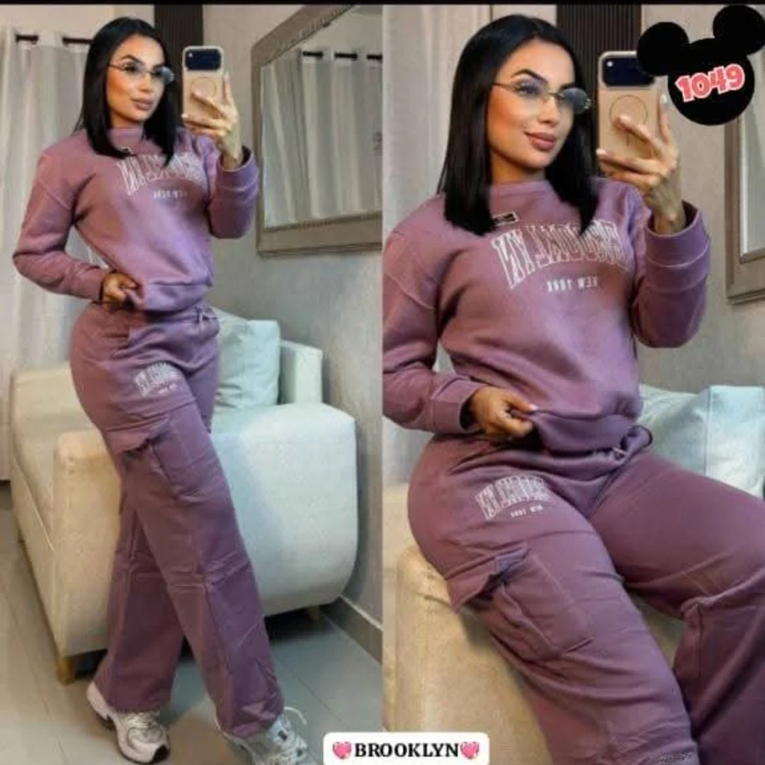 This comfortable two-piece set includes a long-sleeve sweatshirt and cargo pants. Both pieces are a soft purple color and feature "Brooklyn" text graphics. It's great for casual wear!