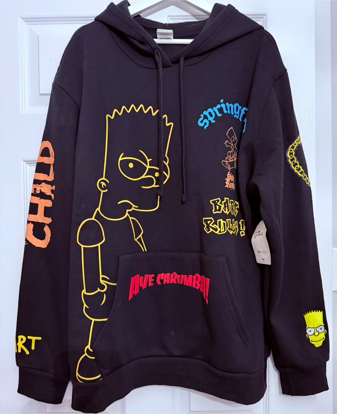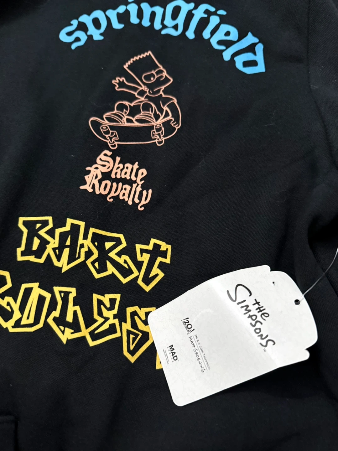This black hooded sweatshirt features Bart Simpson graphics and text from The Simpsons. It's made of a comfortable fabric blend. A fun piece for any fan!