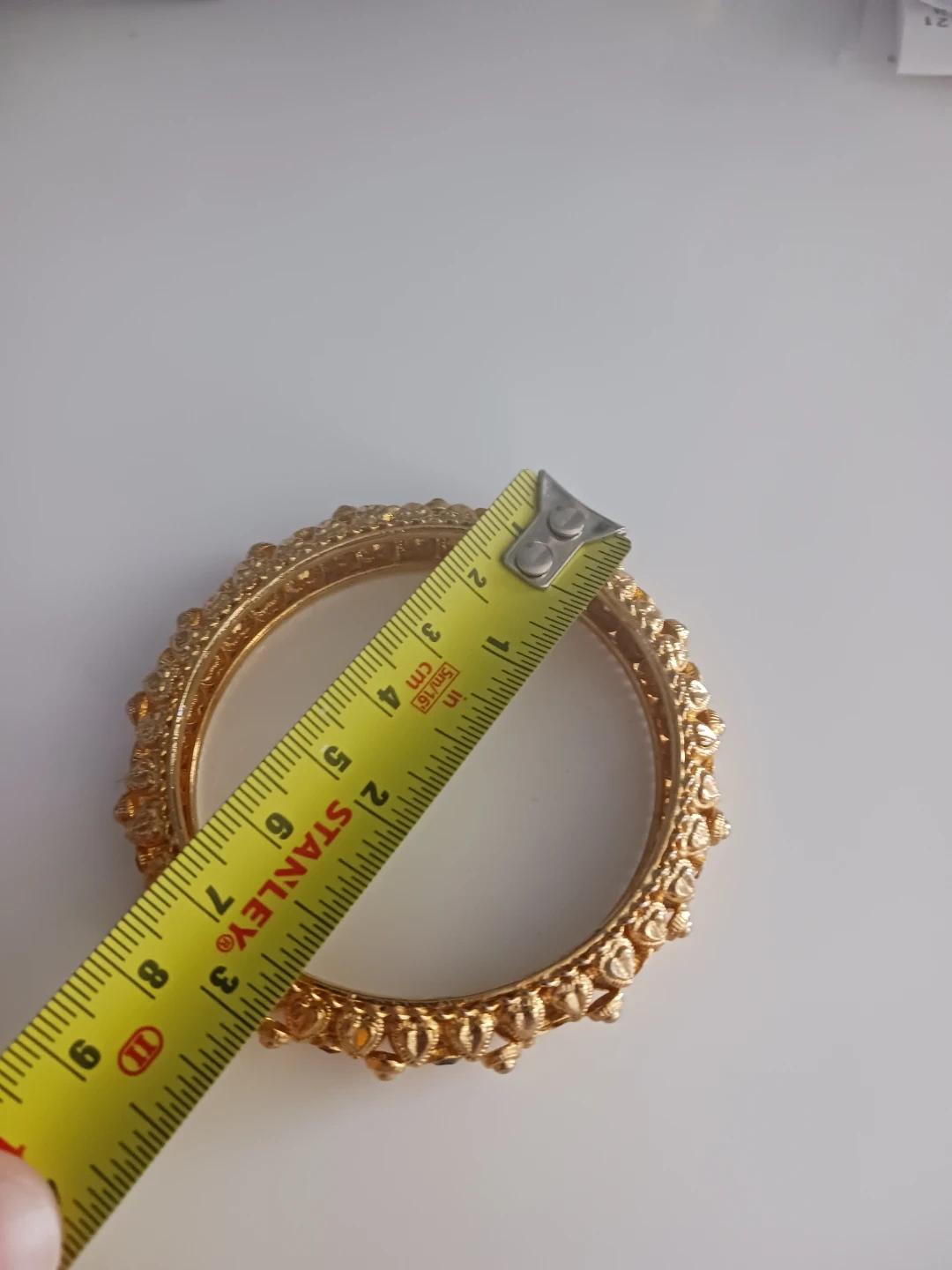 A beautiful gold-tone bangle adorned with small clear and red stones. It features an intricate embossed floral and leaf design all around. The bangle measures approximately 7 cm in diameter.