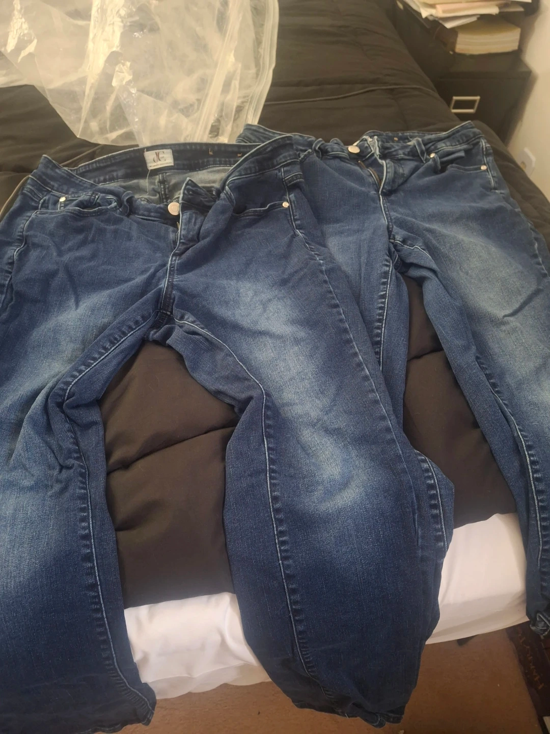 $20 for both Size 16P (meaning its for short people) Two pairs of blue denim jeans from JC. These are comfortable and stylish pants for everyday wear. Material is cotton blend.