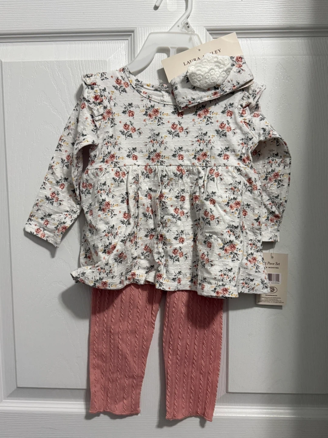 *Brand new, tags on!* Laura Ashley 3 piece set for baby girls. Includes a sweet floral long-sleeve top, pink cable-knit leggings, and a matching headband. Size 18 months. Cotton blend fabric.