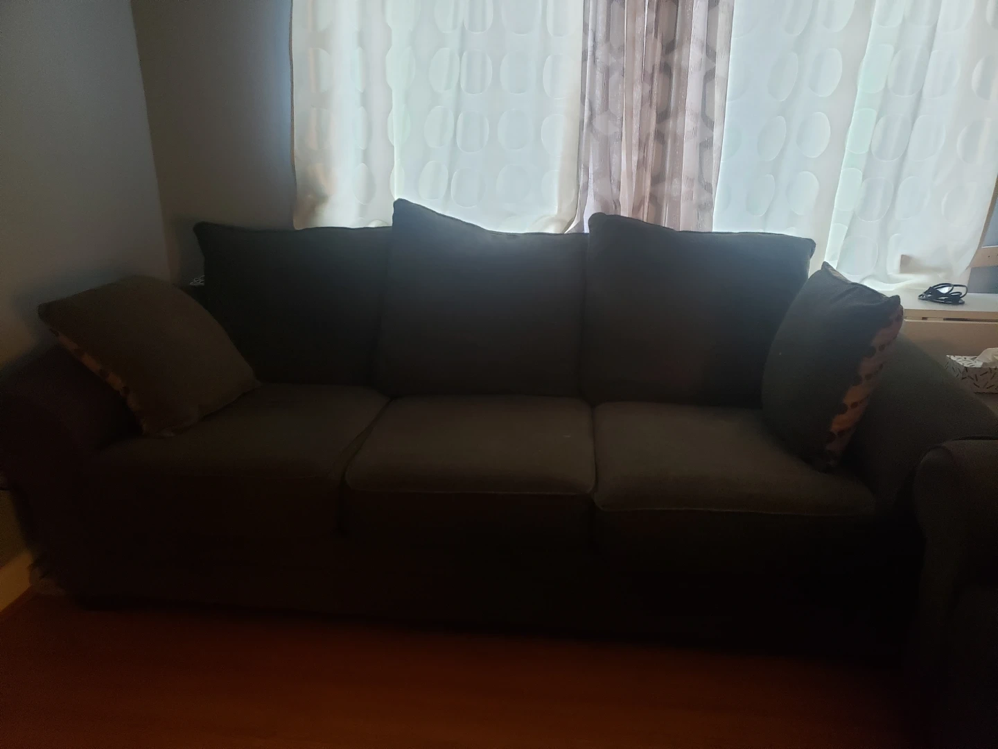 Selling a comfy three-seat sofa. It's a great addition to any living room or den. The colour is a neutral brown, and it comes with a few throw pillows to match. It's in good condition and ready for a new home!