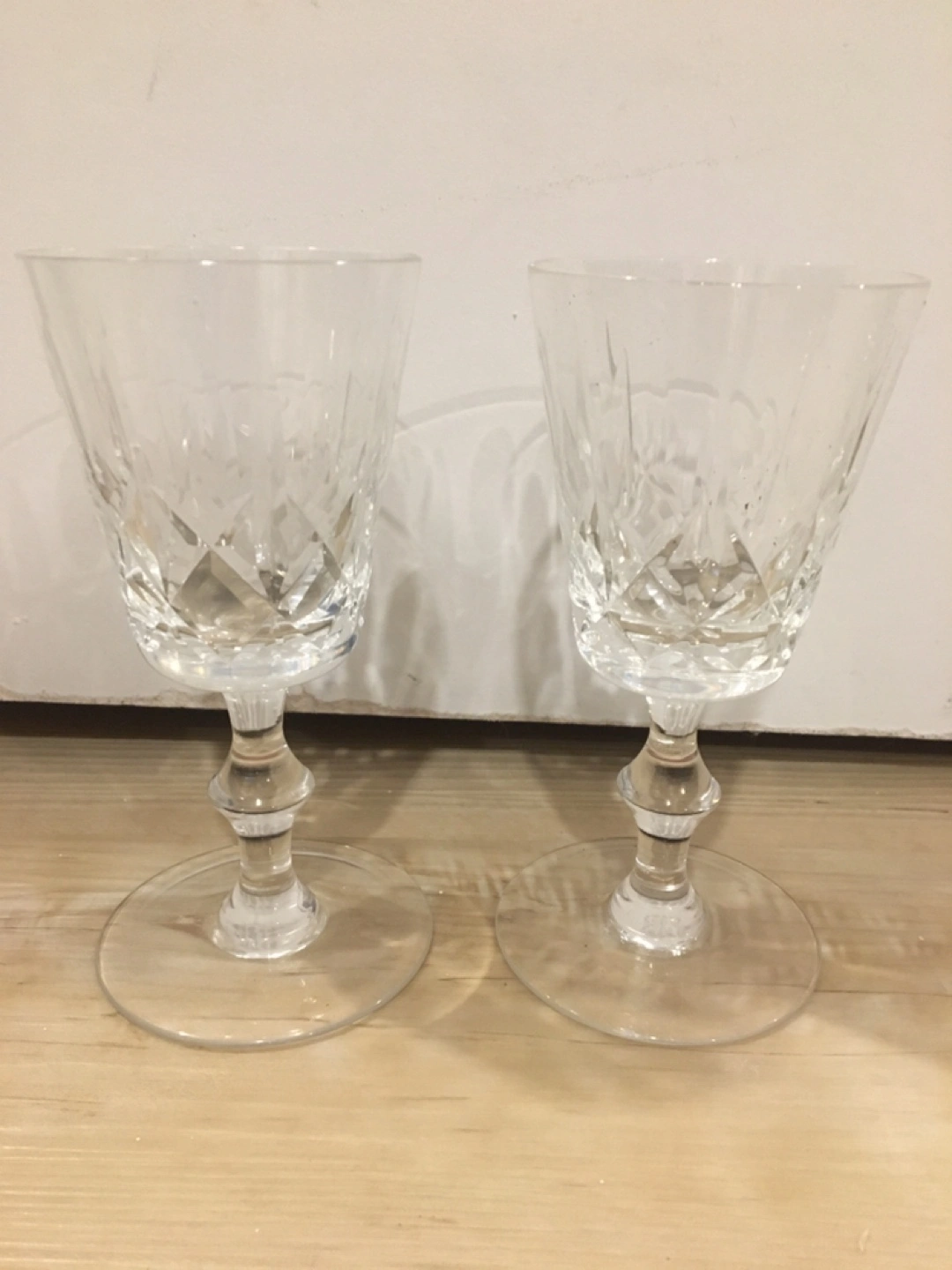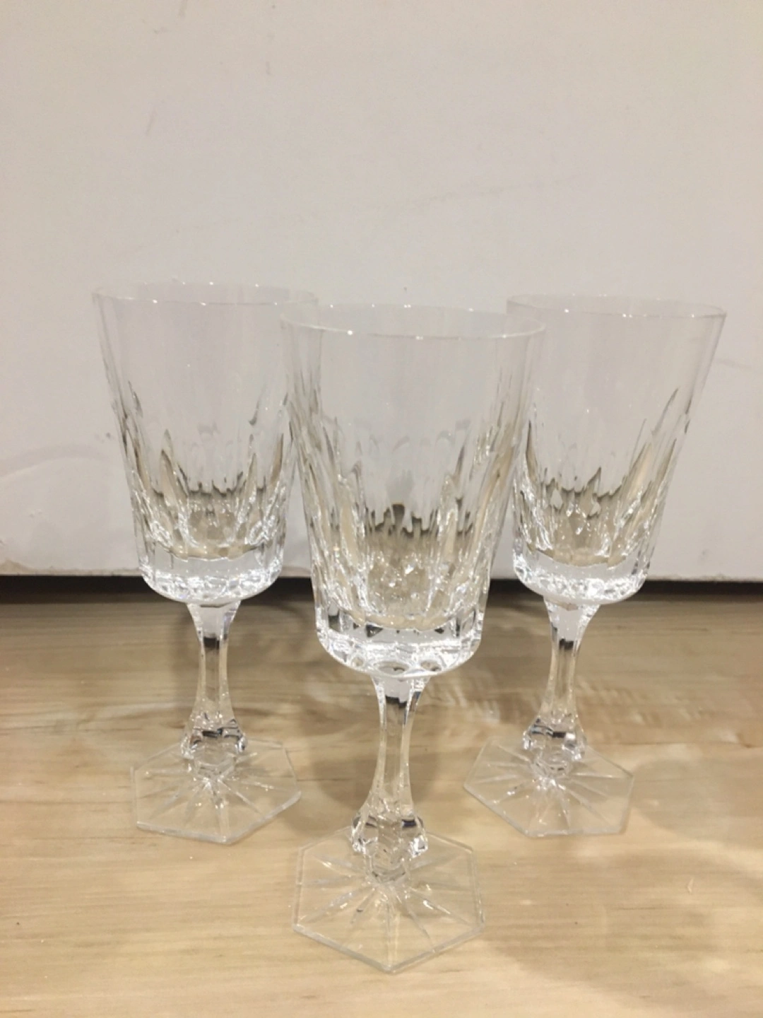 Each glass features intricate diamond and vertical cut patterns on the bowl and a hexagonal base. Perfect for serving wine or other beverages at a dinner party.