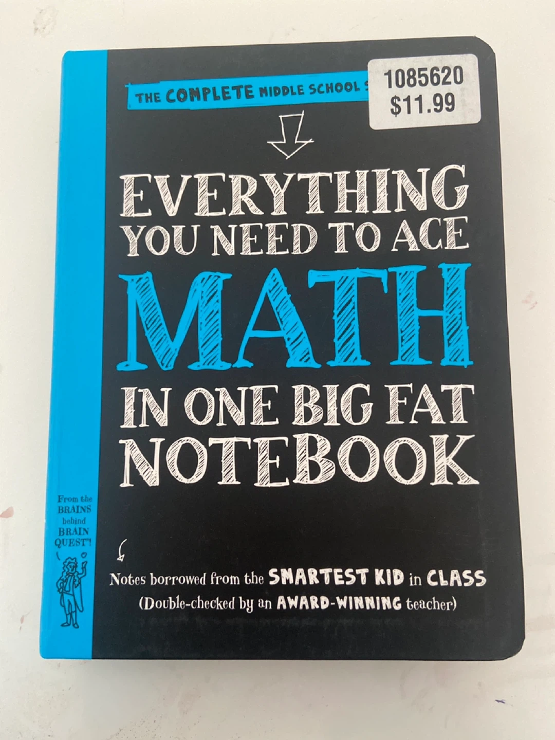 This notebook is for complete middle school math. It contains notes from the smartest kid in class, double-checked by an award-winning teacher. The book is a resource for learning math concepts.
