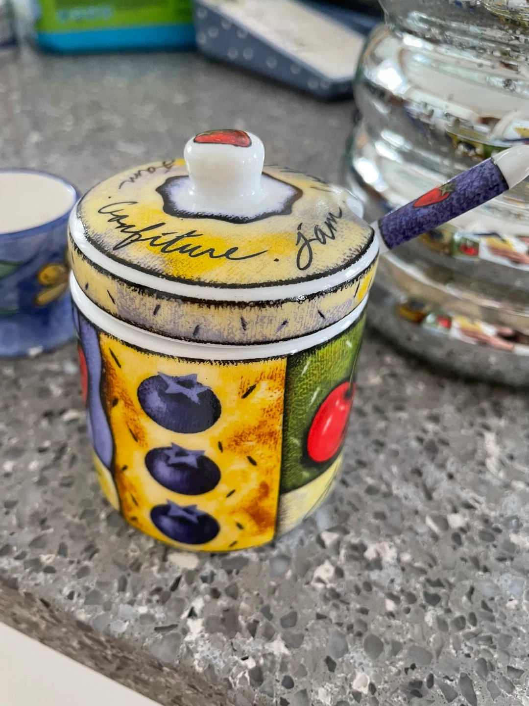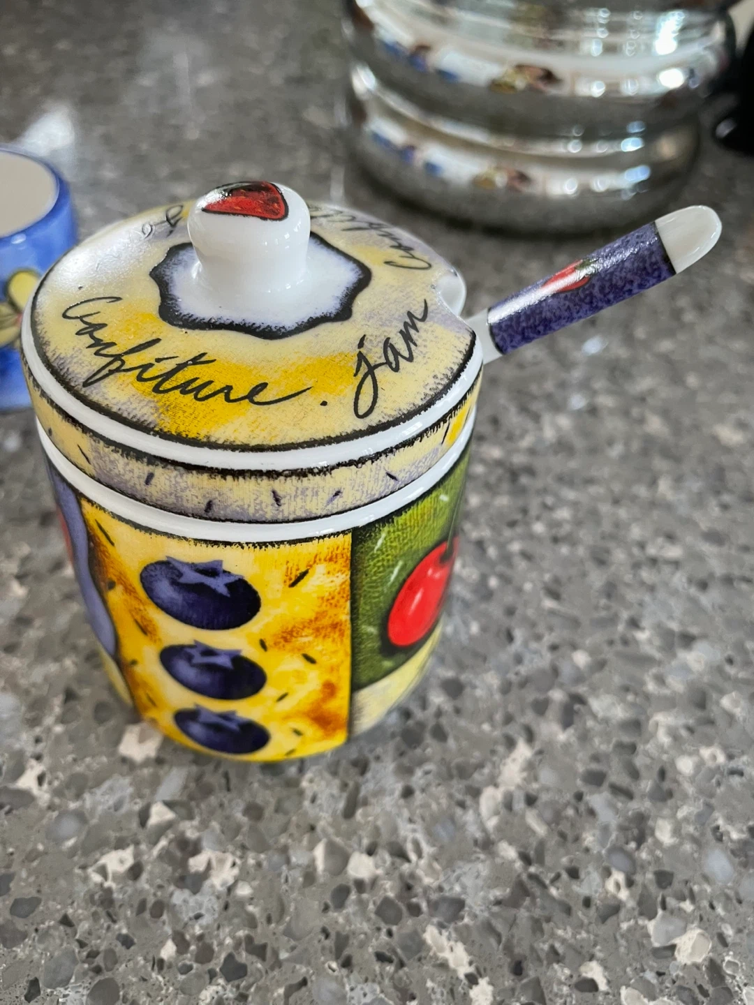This is a charming ceramic jam jar with a lid and matching spoon. It's decorated with colourful fruit designs. Perfect for serving jam at breakfast!
