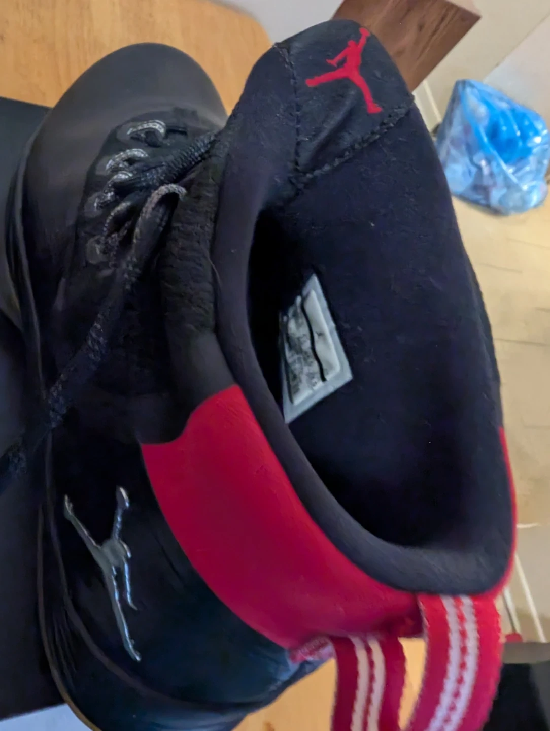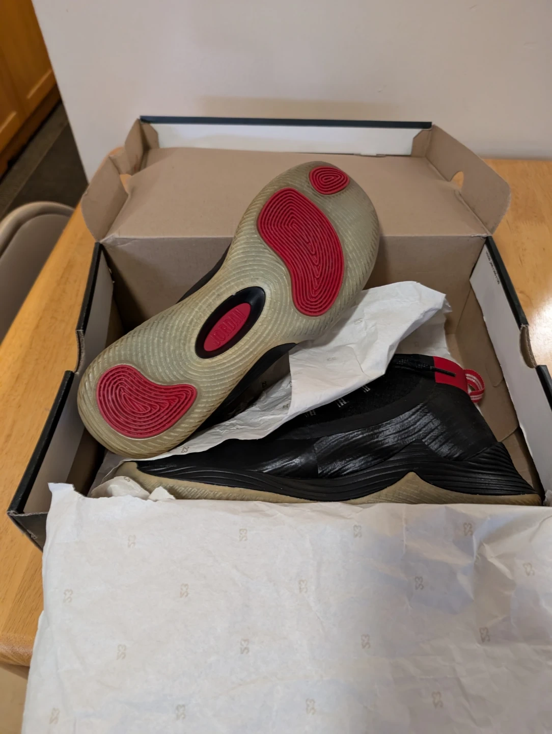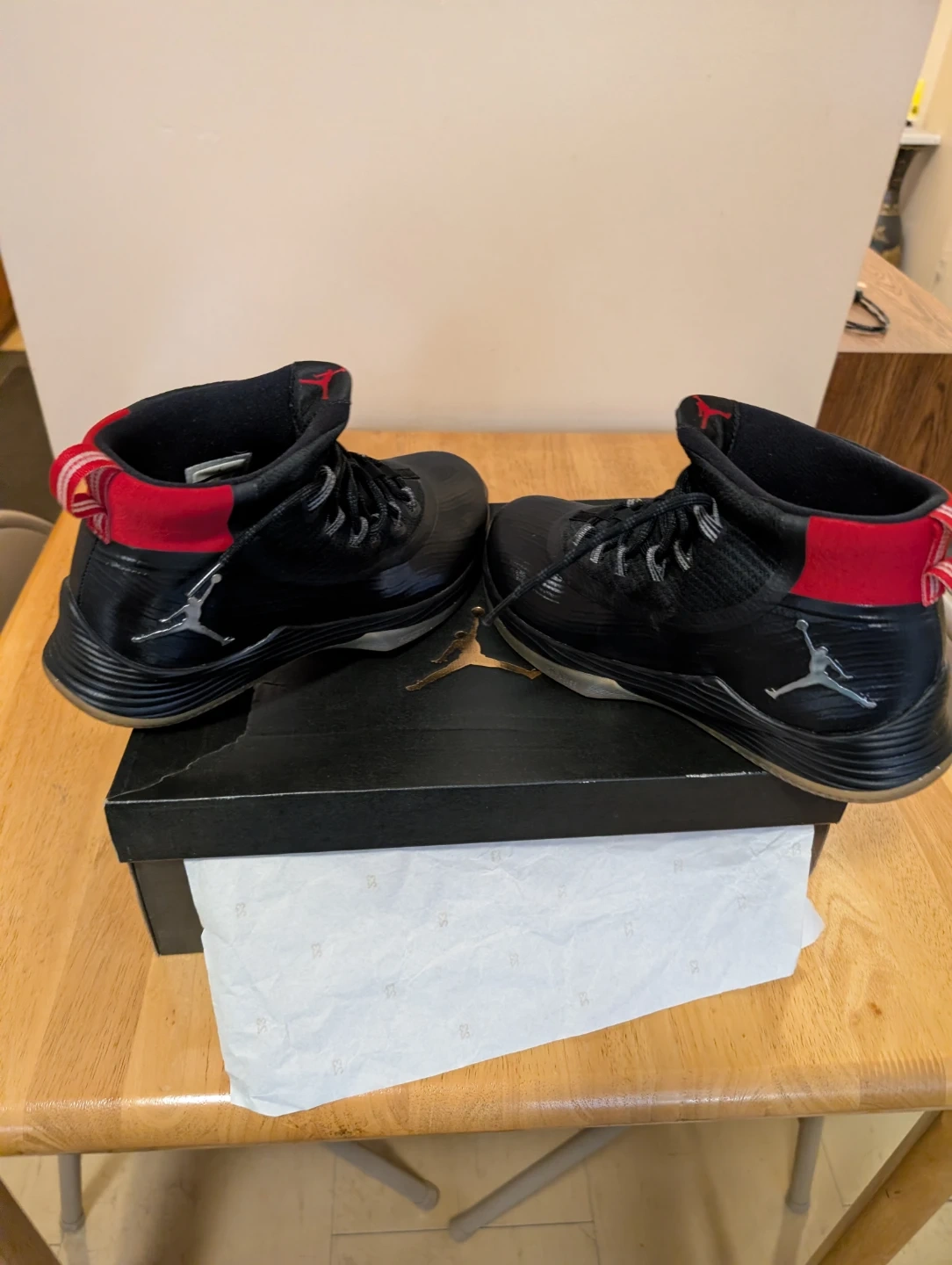 These are Jordan Ultra Fly 2 basketball shoes. They're black with red accents. Includes original box and tissue paper. Brand new never worn size 10.5