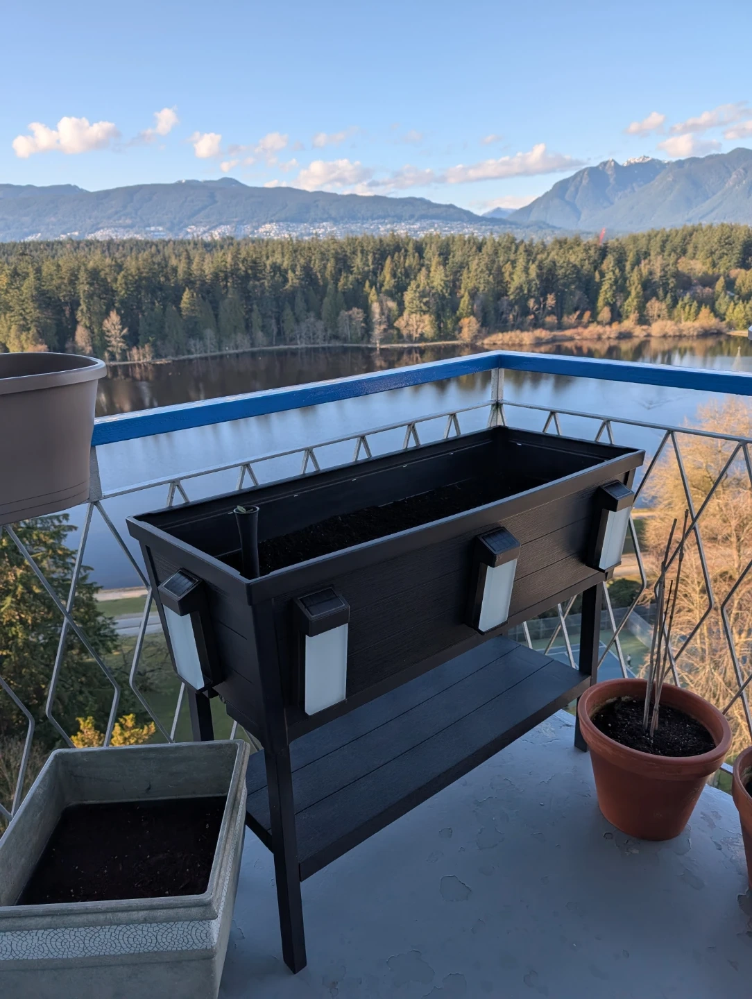This raised garden bed is made of durable black plastic. It features 4 LED solar powered lights.