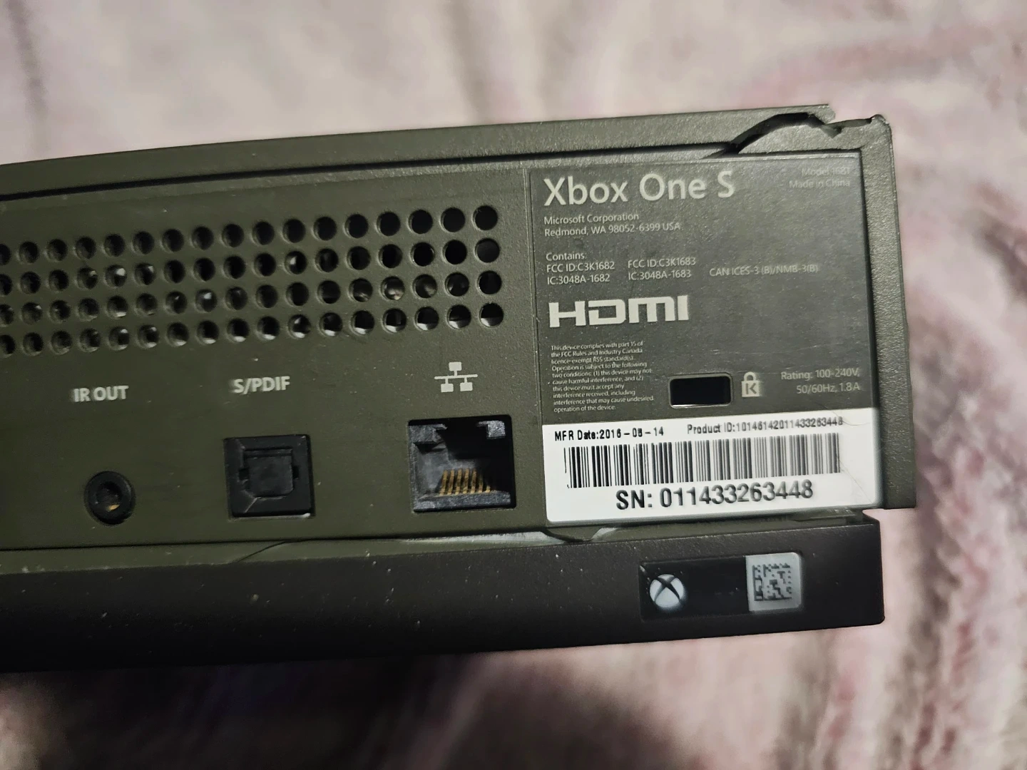 Selling an Xbox One S console. There is some damage on the back of the console as shown in the photos. Manufacturing date is 2018 August 14.