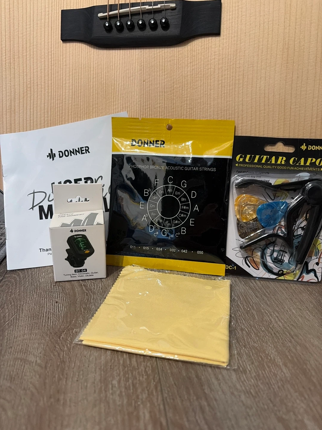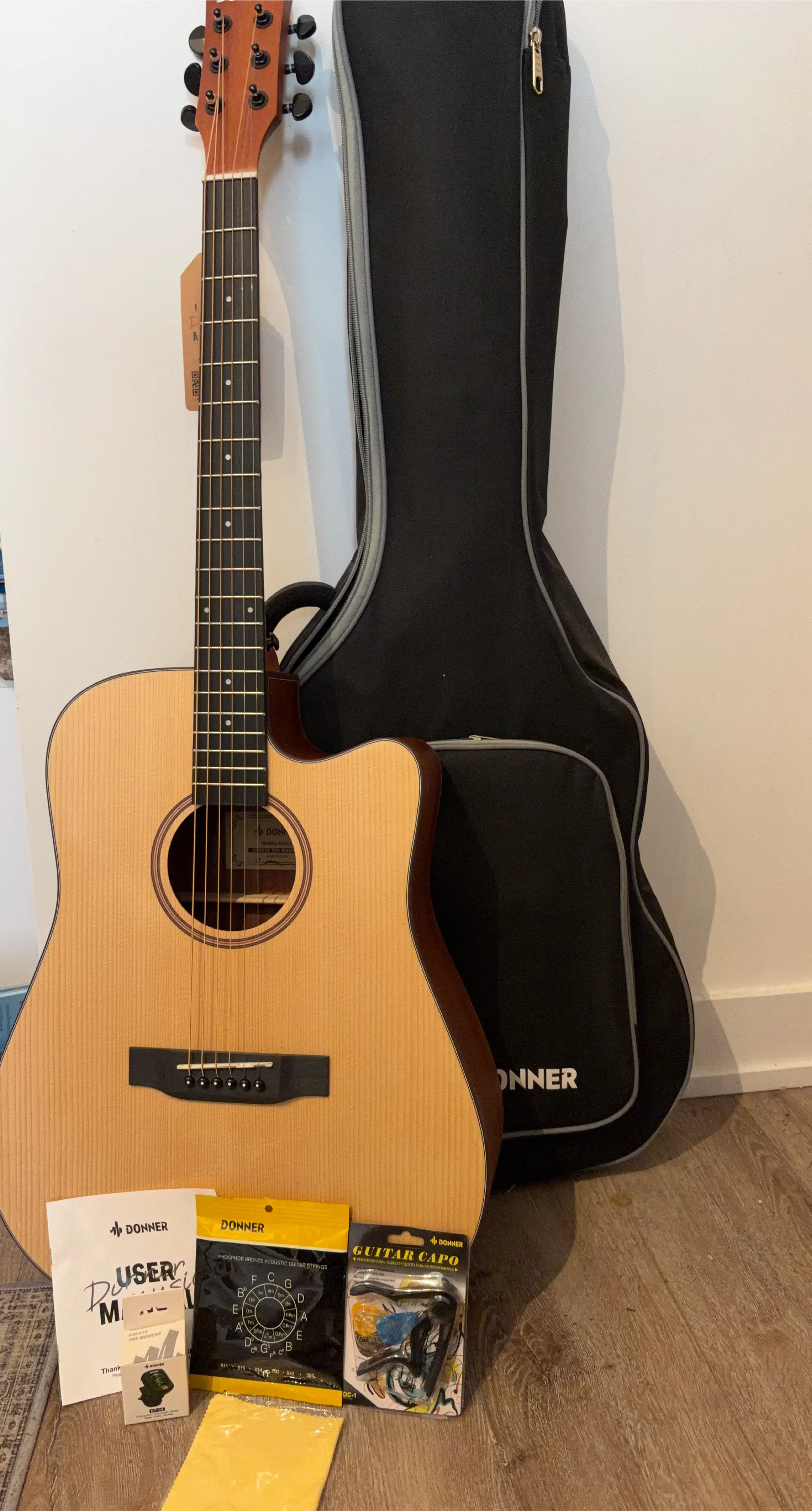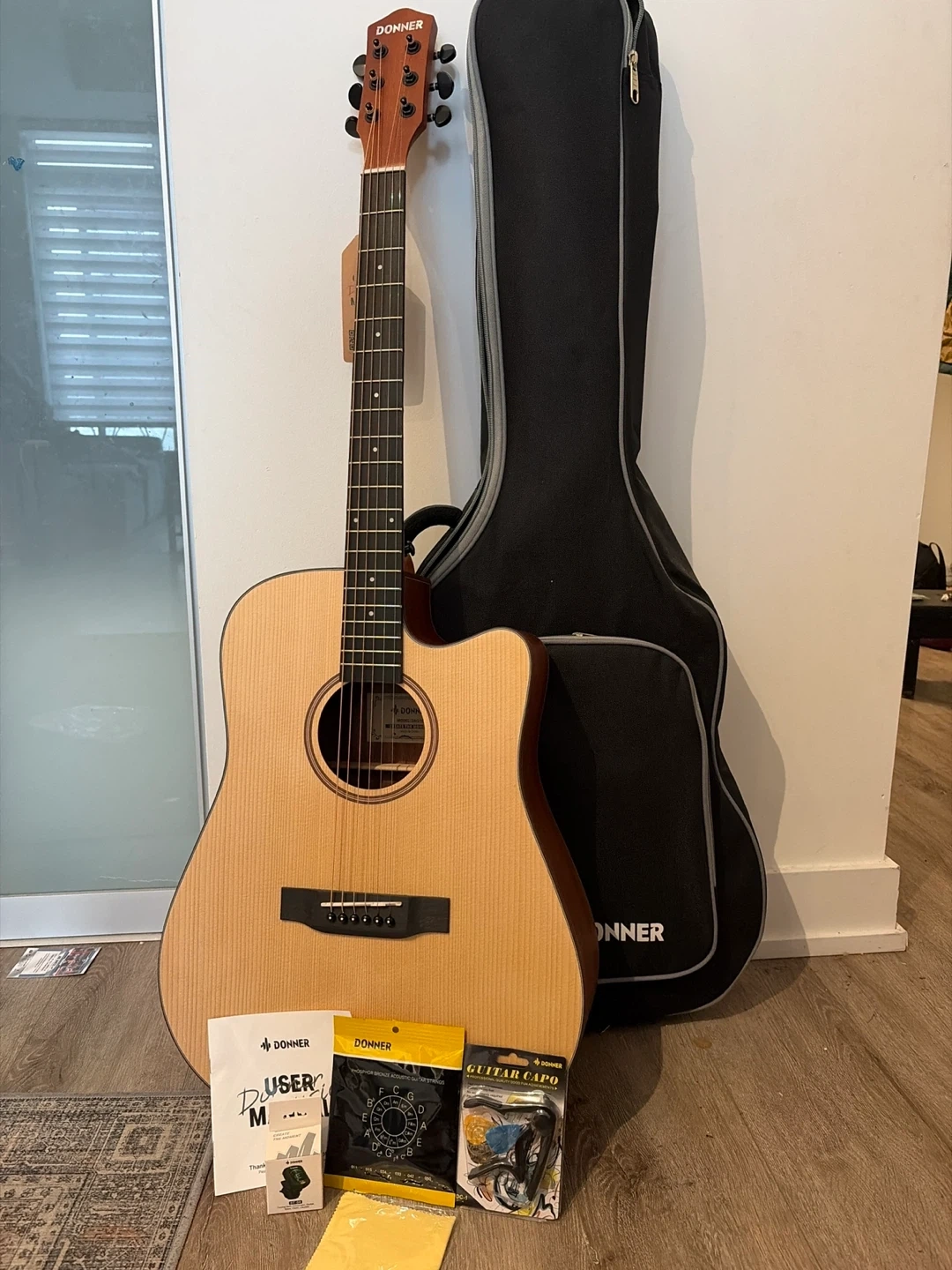 Selling a Donner acoustic guitar that comes with a case and accessories! Included are guitar strings, a guitar capo, a tuner, a cleaning cloth, and a user manual