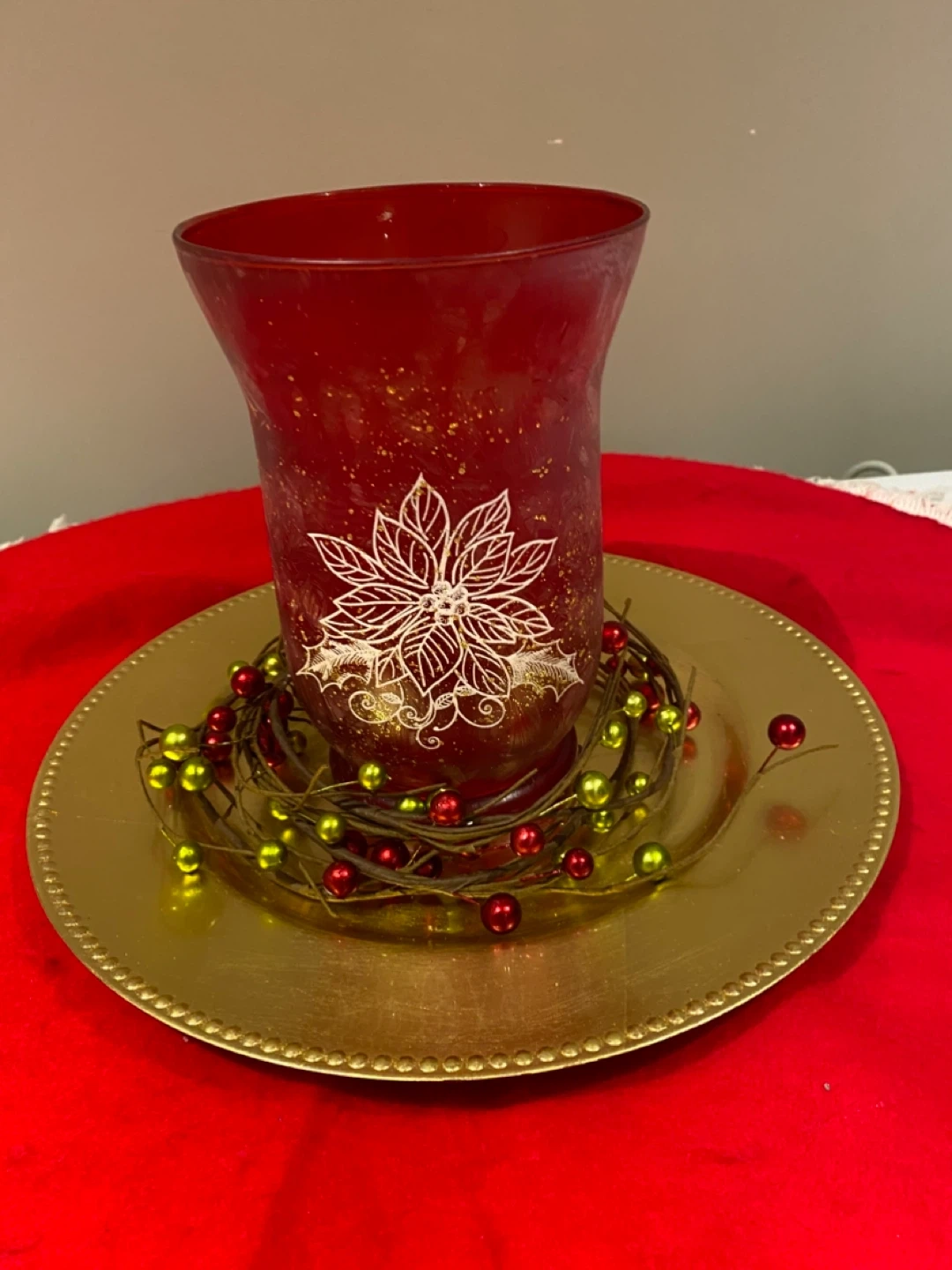 Selling a glass candle holder with a poinsettia design. Comes with a decorative beaded garland. Very festive. In great condition. Tray included